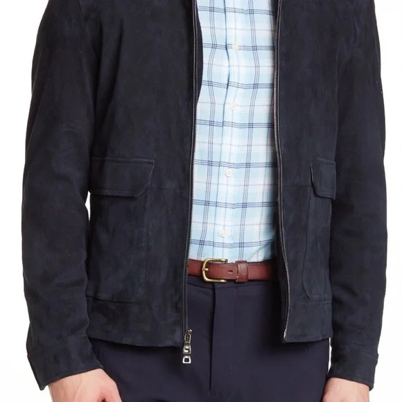 A handsome suede bomber jacket that features the right amount of stretch and a genuine lamb shearling detachable collar.Color: Barchetta/ BlueSize: LargeShearling detachable...