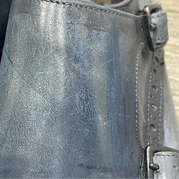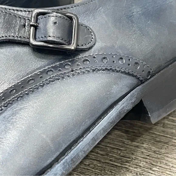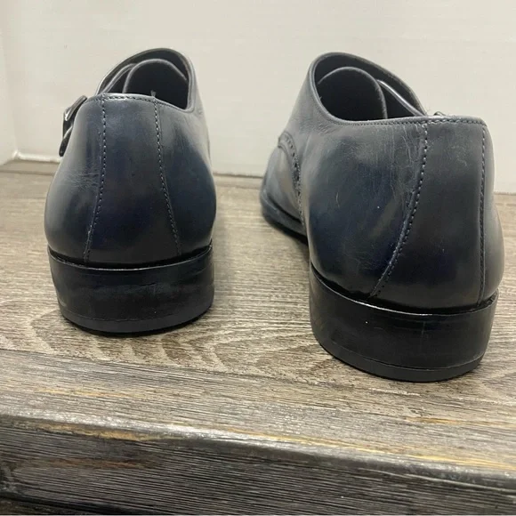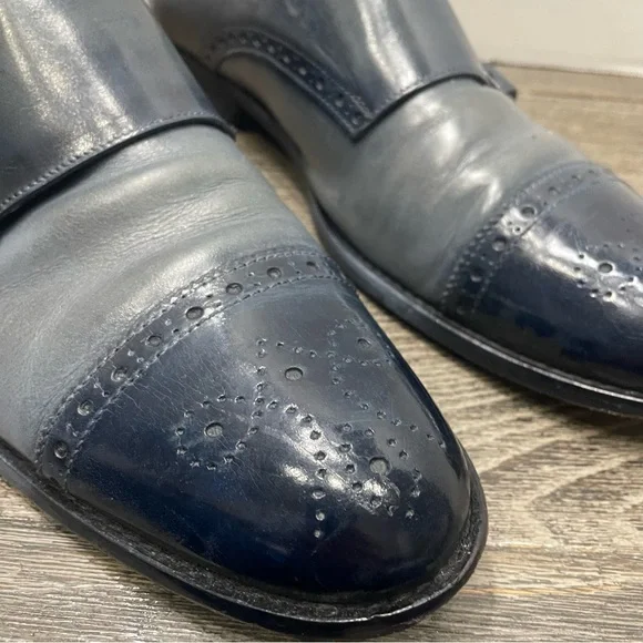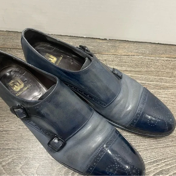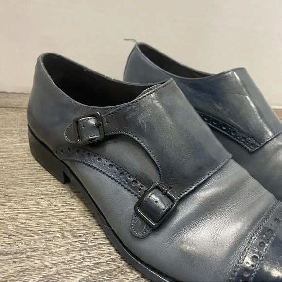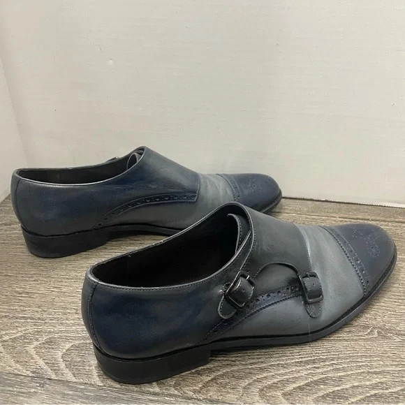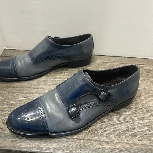 Experience timeless elegance with these Bruno Marc Oxfords, featuring a refined black and slate gray color palette(slight blue hue). The double monk strap design adds a modern twist to the classic silhouette, making them perfect for formal occasions. Crafted with precision, these shoes offer a polished finish and superior comfort.Pre-owned. See detail photos for condition. Alpanzo leather. Made in Italy.