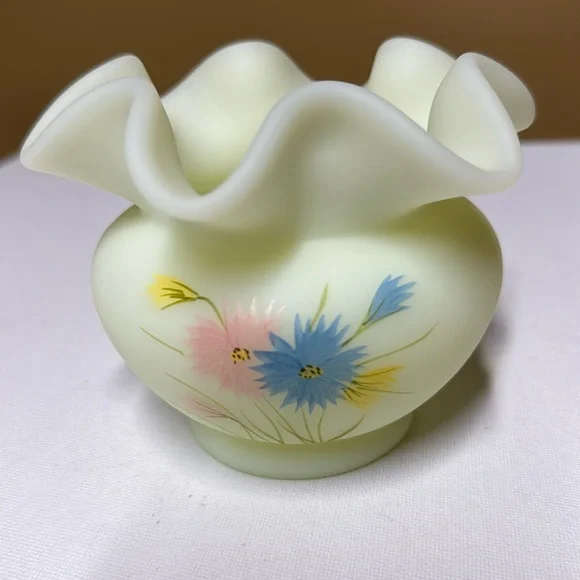 Fenton asters on yellow custard satin glass rose bowl vase 3.75” tall