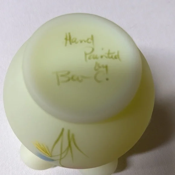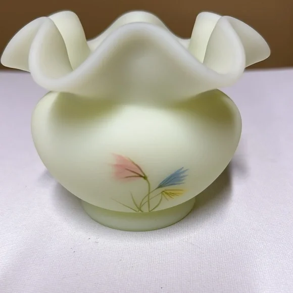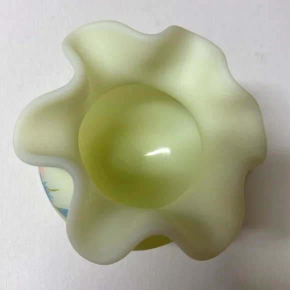 Fenton asters on yellow custard satin glass rose bowl vase 3.75” tall 4.5” diameter Glows under black light Beautiful in perfect condition with no breaks or chips (6527248)