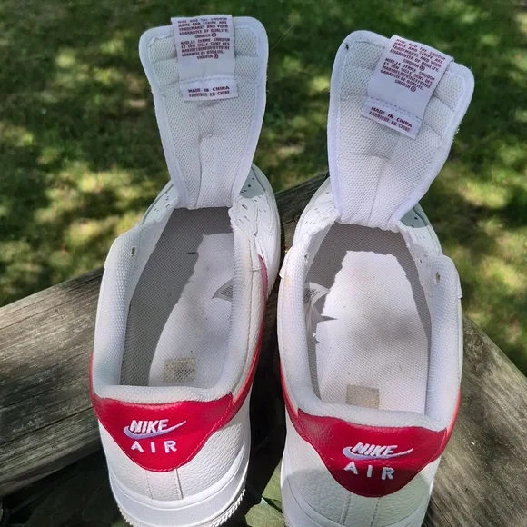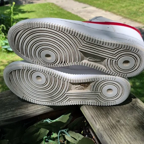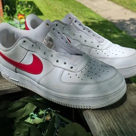 Classic Nike Air Force 1 with a white leather base and bold red swoosh. Ideal for everyday style.A few spots of slight discoloration (look at second to last photo) No laces but i do have the original metal lace tags: (see last photo) Questions welcome and reasonable offers accepted.