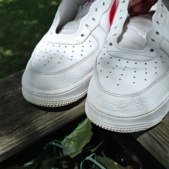 Classic Nike Air Force 1 with a white leather base and bold red swoosh. Ideal for everyday style.A few spots of slight discoloration (look at second to last photo) No laces but i...