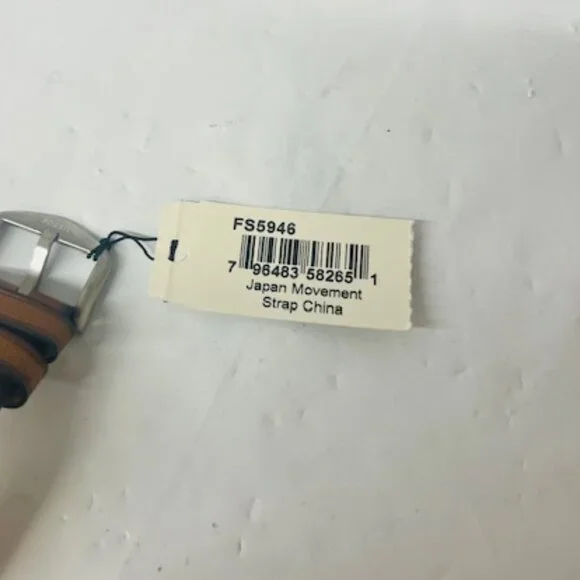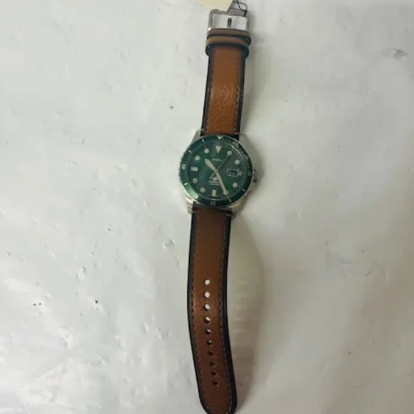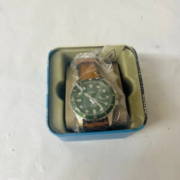 *brand new/ never used**Box is dented (shown in photo)*Sku: FS5946Case Size: 42MMMovement: Quartz Three-Hand DatePlatform: FOSSIL BLUE DIVEStrap Material: LiteHide™ LeatherStrap Color: BrownCase Water Resistance: 10 ATMCase Material: Stainless SteelCase Color: SilverDial Color: GreenStrap Fashion Color: TanInterchangeable Compatibility: 22MMStrap Width: 22MMClosure: Single Prong Strap BuckleStrap Inner Circumference: 200+/- 5MMCrystal Type: MineralBattery Type: SR626SW
