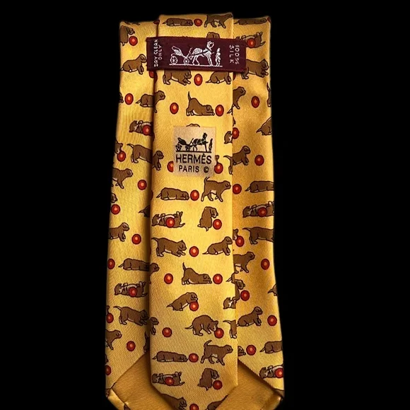 A whimsy tie from Hermes. Bright playful yellow tie with dog and ball print. Add some color to your attire! This tie has a pointed tip and is in excellent condition.The colors are...