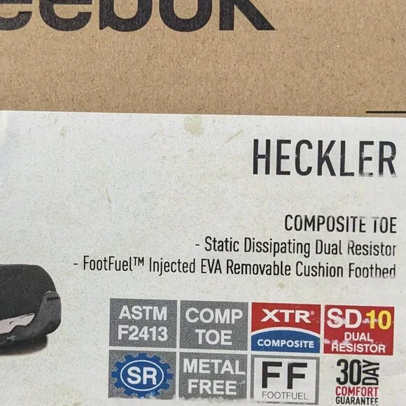 Reebok Heckler work sneakers for men in excellent condition. Shoes show minor signs of wear. Ships in the original shoe box.- Composite safety toe- Oil and slip resistant- Electrical hazard protection- Wide width