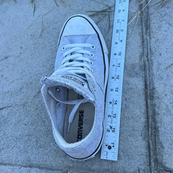 This is a gently used pair of gray all star converse low top vintage looking shoe sneakers. They are a size men’s 7, women’s 9. No visible flaws. Measurements are approximate and shown on photos. Photos are part of the description.