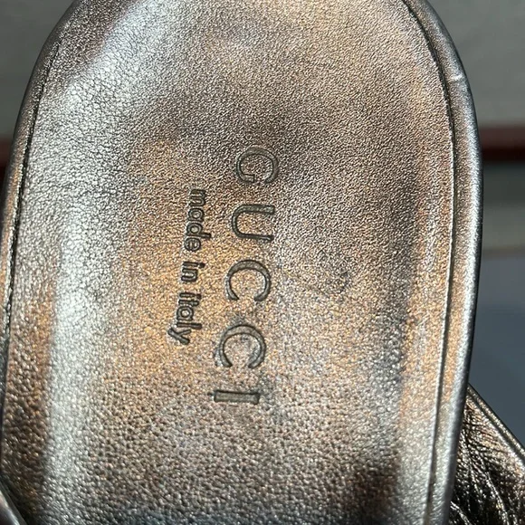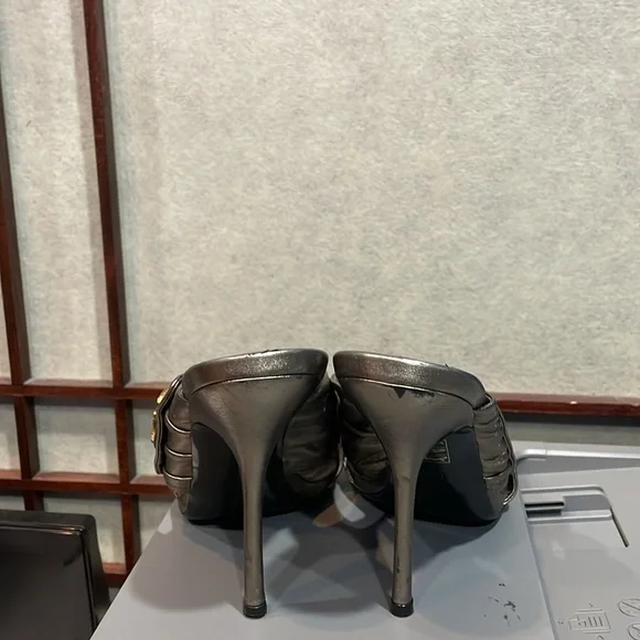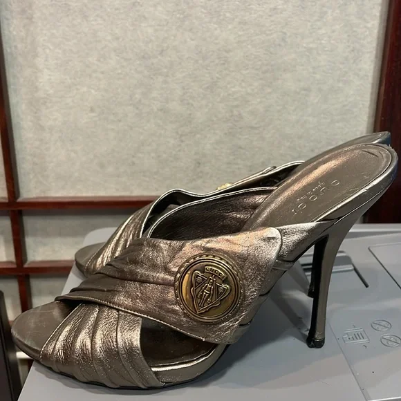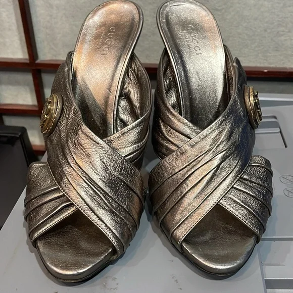 Gold Leather Cris Cross Open Toes Slip On Stiletto Heels Size Euro 37 1/2 C, US 7 Women Shoes.These are preowned which does show normal use.Please view pictures