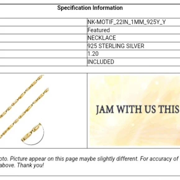 Specification Information Product Code:NK-MOTIF_22IN_1MM_925Y_YProduct Categories:FeaturedProduct Type:NECKLACEMetal Type:925 STERLING SILVERTotal Weight by Gram:1.20