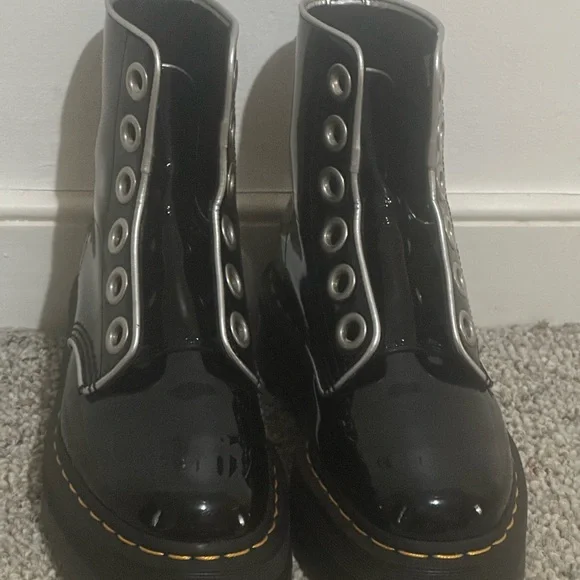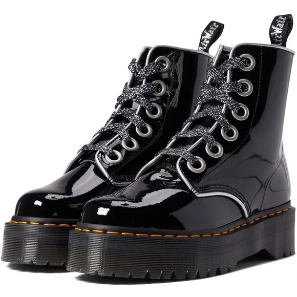 Stylish black patent leather boots featuring bold yellow stitching and silver eyelets.