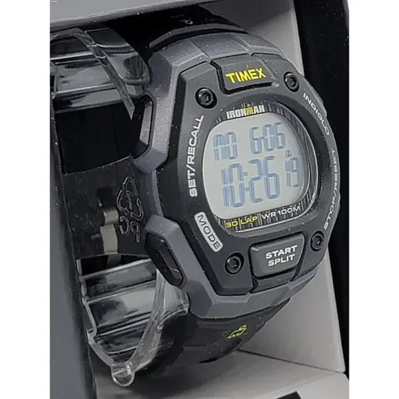 Calendar: day, month & dateAlarmHourly chime12/24-hour formatsChronograph30-lap memory24-hour countdown timerIllumination: Indiglo backlightFace cover material: acrylicMaterial: gray & black resin with stainless steel backDiameter: 42 mmMaterial: black resinClasp: buckleCircumference: 205 mmWidth: 18 mmMovement: quartzPower: batteryWater resistance: 100 meters