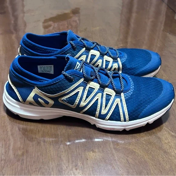 The Salomon Crossamphibian Swift 2 Shoes are designed for outdoor enthusiasts who need versatile footwear for both land and water activities. These shoes offer comfort, durability, and quick-drying capabilities.Breathable Mesh Upper: Provides excellent ventilation and quick drying.Sipping Outsole: Ensures superior grip on wet and dry surfaces.Recycled Materials: Eco-friendly construction using sustainable materials.Collapsible Heel: Allows easy slip-on convenience and versatile wear.EVA Midsole: Offers lightweight cushioning and support for all-day comfort.TLDR; The Salomon Crossamphibian Swift 2 Shoes deliver versatility, comfort, and quick-drying performance, making them ideal for outdoor activities both on land and in water.This item comes from a smoke free and pet free environment.