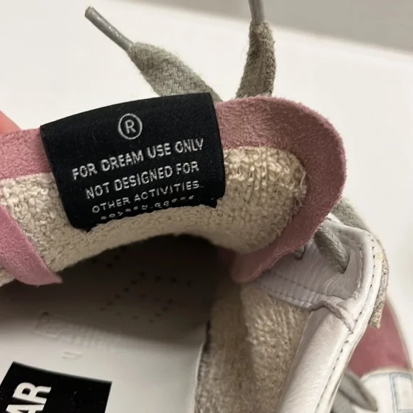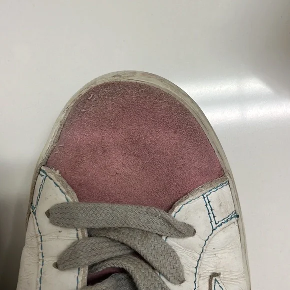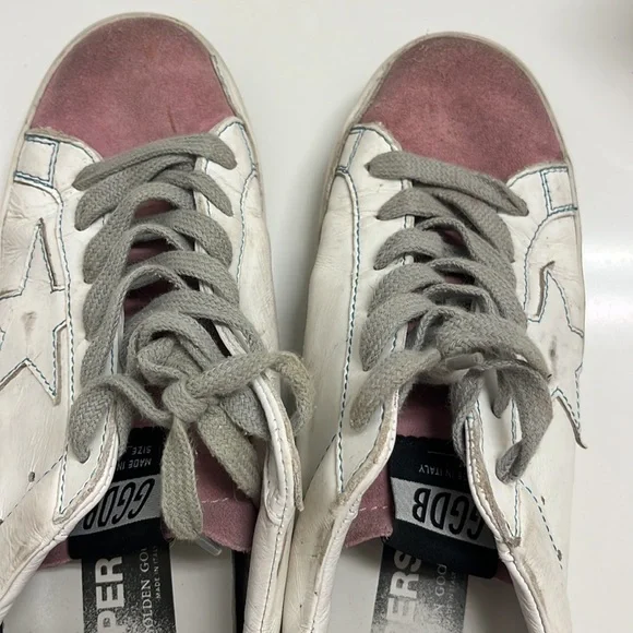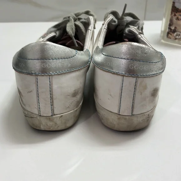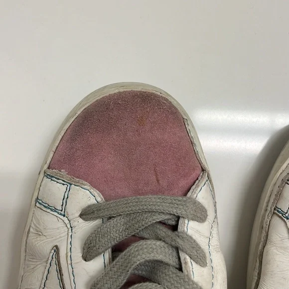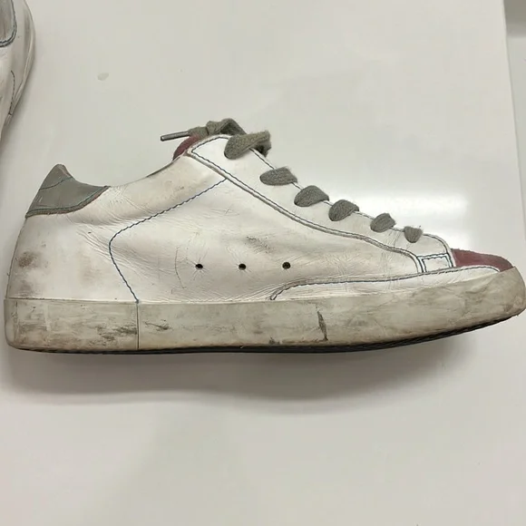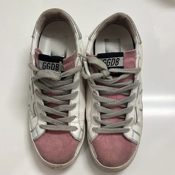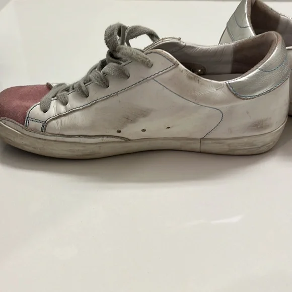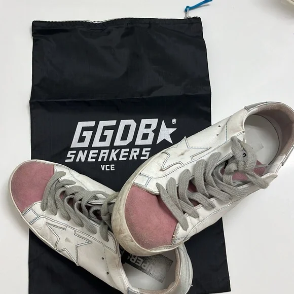 Low top golden goose sneakers with bag. Size 37. Silver on heel and pink suede on toe and tongue. Gray laces.