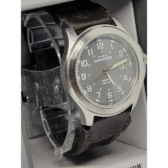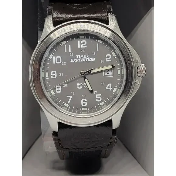 Dial: charcoal with Indiglo backlight, silver-tone hands & white Arabic numeralsWater resistance: 50 metersMovement: quartzPower type: batteryCalendar:DateQuickDate function12/24-hour formatsFace cover: mineral crystalCase color: silver-tone brassCaseback: stainless steelBand color: brown nylon & leather (adjustable)Case width: 40-mmBand width: 20-mm