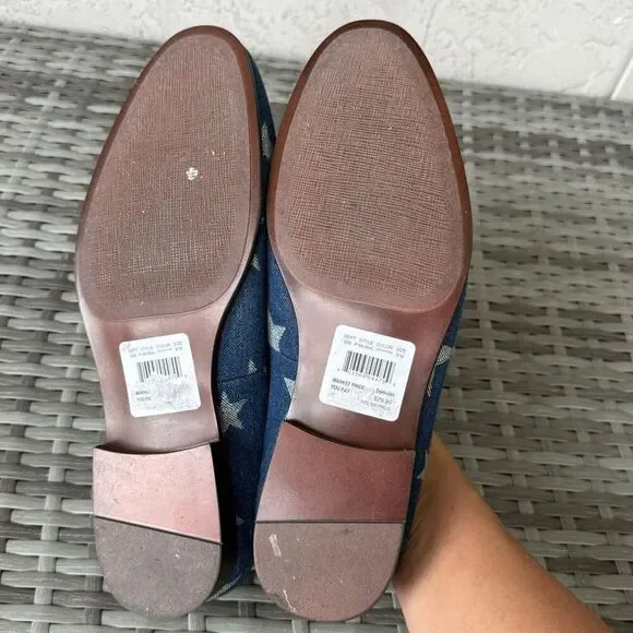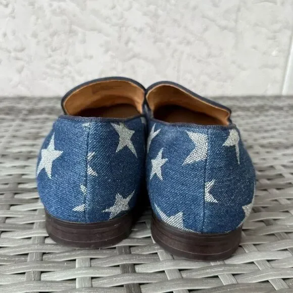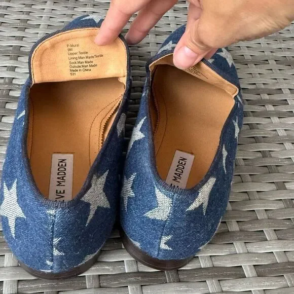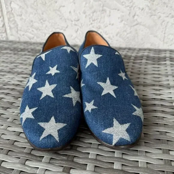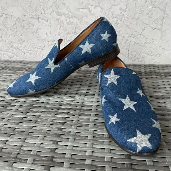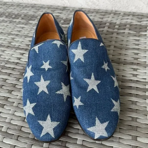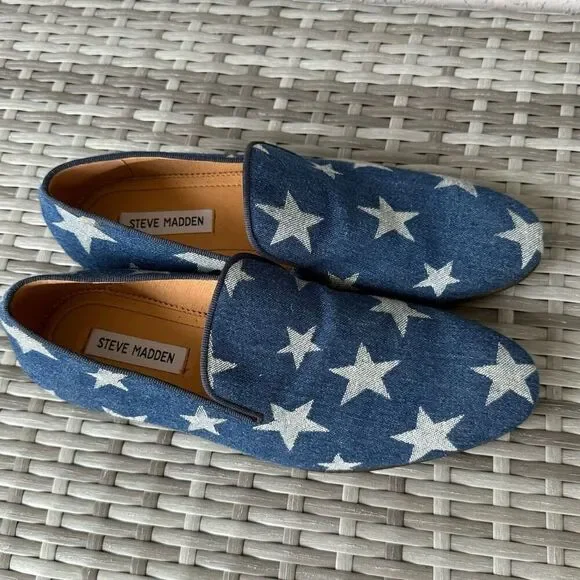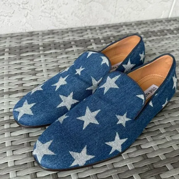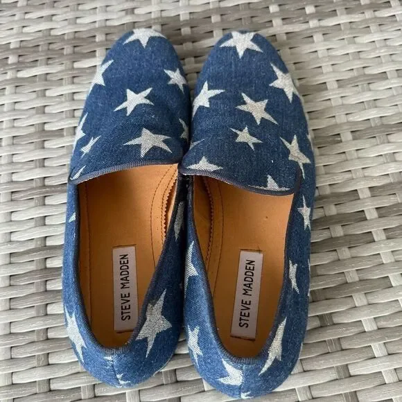 Steve Madden Lodestar Slip-On Loafer Denim Fabric with White All-Over StarsMSRP $95No box includedMen’s size 9 M USExcellent preloved condition - small scratch on bottom of heel...