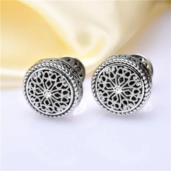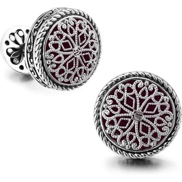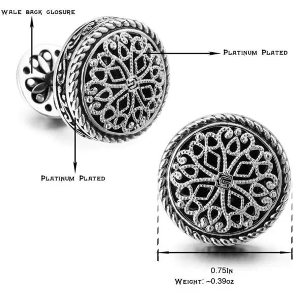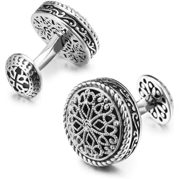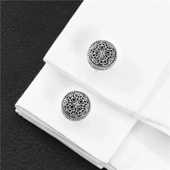 *LUXURIOUS SILVER CUFFLINKS FOR MEN: Featuring platinum-plated cuff links with a striking front face, as well as a platinum-plated cuff link cup. Adorned with a Vintage Celtic Cross embellished with a Filigree Floral Design, each piece undergoes a meticulous high polishing process to achieve a flawless finish.*THE ULTIMATE ENSEMBLE: Versatile for weddings, formal occasions, and professional settings, this set enhances your attire with a refined touch, making it a perfect gift for men, grooms, fathers, bosses, boyfriends, and husbands.*IDEAL GIFTING SOLUTION: Whether for weddings, anniversaries, birthdays, special events, or business partnerships, these silver tuxedo studs and cufflinks set symbolize elegance and sophistication, making them a cherished gift choice.*DELUXE GIFT BOX: Each set is elegantly packaged in a sleek wooden box, ready for presentation as a thoughtful gift. Additionally, the box doubles as a stylish storage solution for the cufflinks.