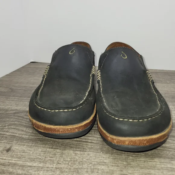 Olukai Moloa Black Leather Comfort Slip-On Shoes Men’s Size 9.5