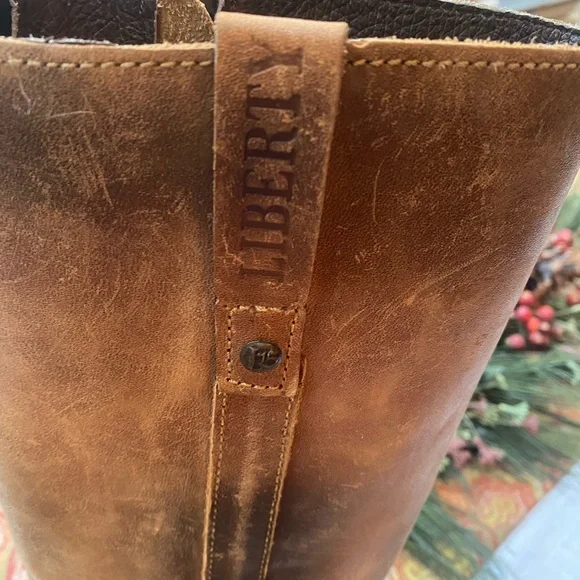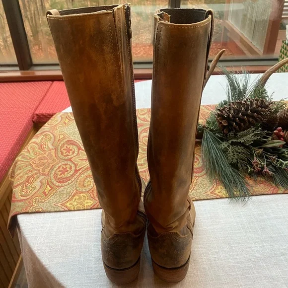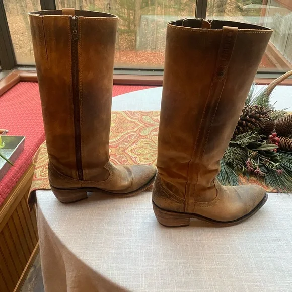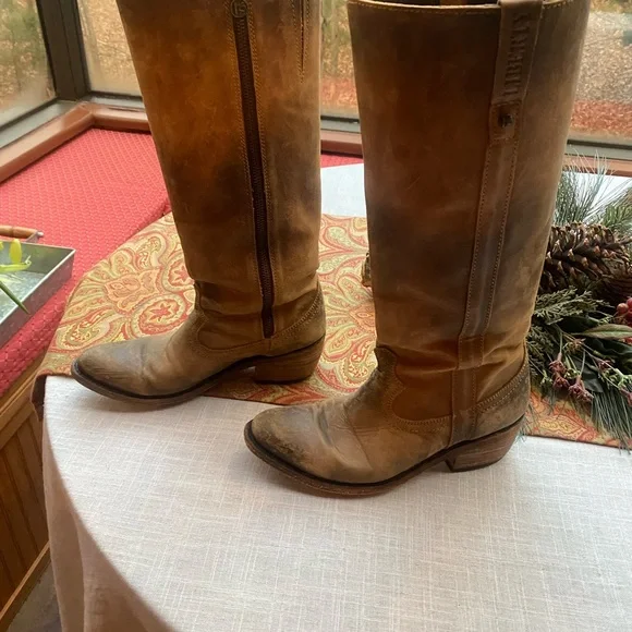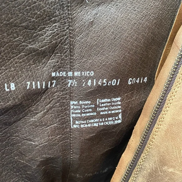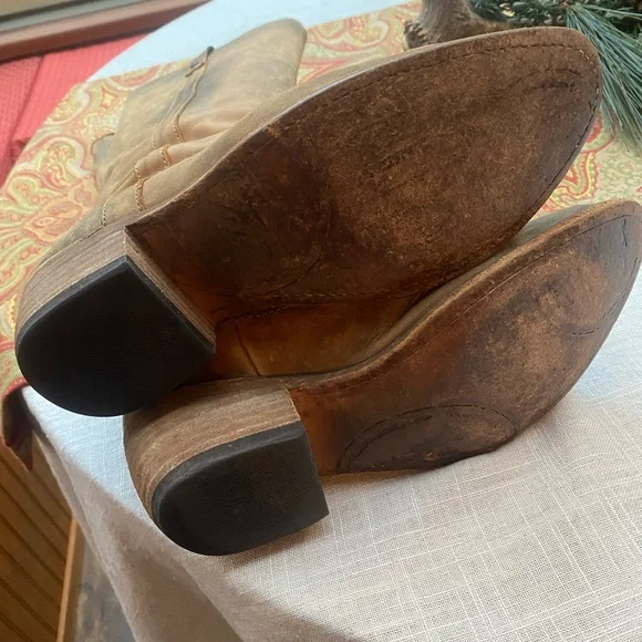 These distressed leather boots are handmade in Mexico. The boots are in very good preowned condition and look the same as when I purchased them in Jackson Hole. Even the soles are distressed. The look is intentional and not due to wear. The size is 7.5. I normally wear an 8. They are a perfect fit for me. This is a smoke free home.