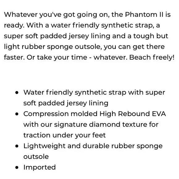 Water friendly and super comfortable sandals with soft padded synthetic strap, molded EVA footbed and durable outer sole with diamond texture for good traction. Lost the tag, mightfind it again.BeachSummerArch support