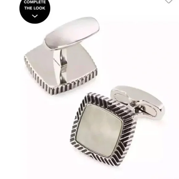 Enhance your formal attire with these elegant silver cuff links from Link, featuring a distinctive square design with a textured border. The cuff links are crafted to add a touch of sophistication to any ensemble, making them a perfect accessory for special occasions.