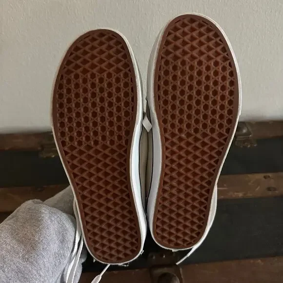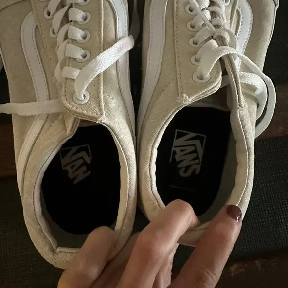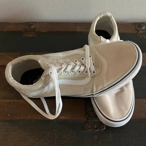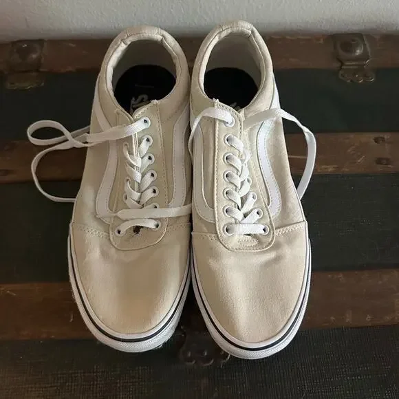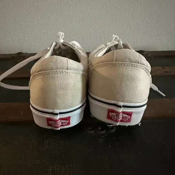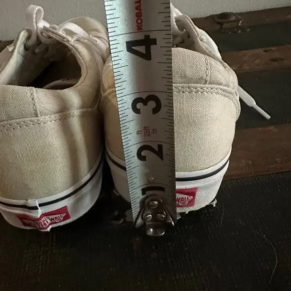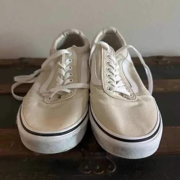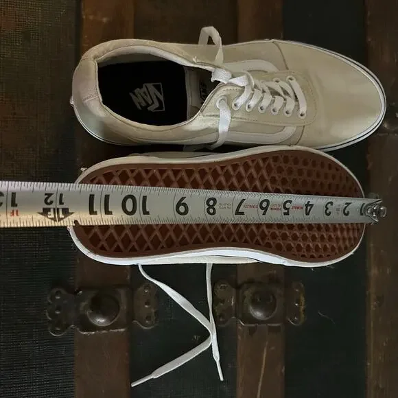*Please read all details, below, carefully. All measurements are pictured. sometimes item might not have size label. If so, it is noted and estimated for sizing. If you need extra measurements, please ask : ). Thank you for shopping with us!*Gently Used, Pre-OwnedNo holes, no tears, no stainsVans Low Top, Tie Up, SneakersSIZE: 10.5Color: Beige/WhitePlease see pictures for measurementsSmoke, pet free home