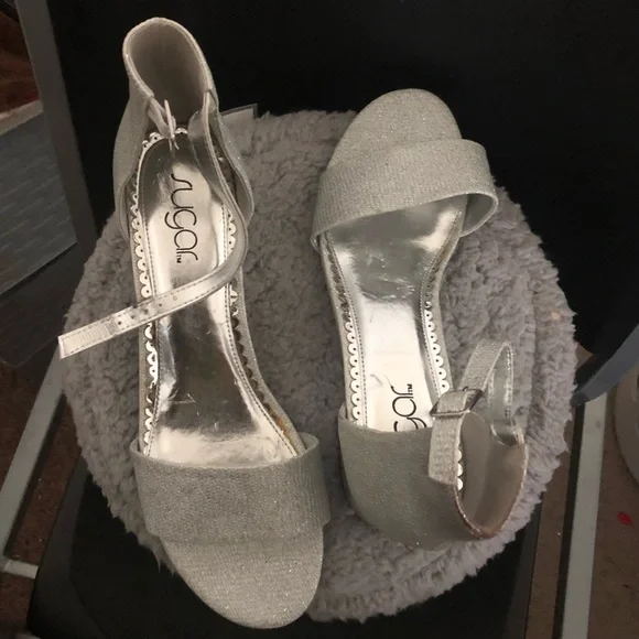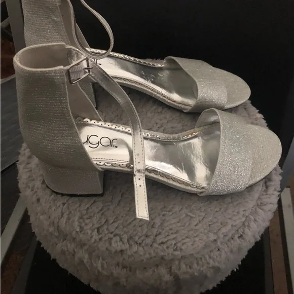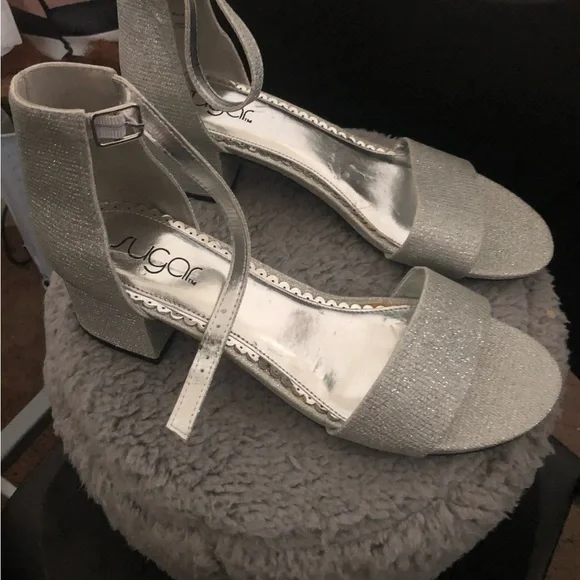 Sparkle in Style with Glittery Block HeelsUnveiling the perfect blend of glamour and practicality, these sugar glitter silver heels are a must-have for every fashion-forward woman´s closet.Fabric Composition: Crafted from 100% Synthetic Material.Imported Quality: Designed with precision and care from China.Secure Fit: Buckle closure ensures a snug, comfortable fit.Water Resistance: These heels are not water-resistant.Why You´ll Love These Heels:- **Timeless Elegance:** Strappy heels are the epitome of luxury and high fashion, seamlessly enhancing the feminine silhouette. Step into these and become the focal point of any room.- **Block Heel Style:** Featuring the chic Noelle design, these heels come with a low, sophisticated block heel that offers both elegance and stability. Perfect for those who want to make a statement.- **Chunky Comfort:** With a classic, sturdy design, these heels promise all-day comfort thanks to their latex insole and ideal heel height. Adjustable ankle straps provide a custom fit for added support.- **Versatile Design:** Whether it´s a party, prom, wedding, or a day at the office, these sandals with their soft lining, cushioned footbed, and slip-resistant sole are your go-to choice.**Measurements:** Enjoy a versatile heel height of 3 inches, with other designs available at 2 inches.