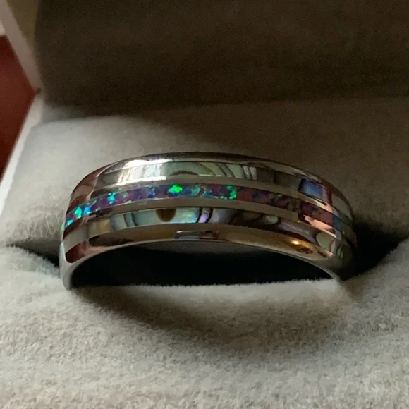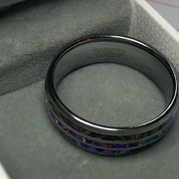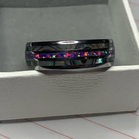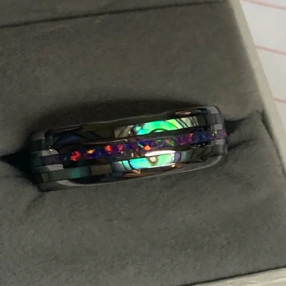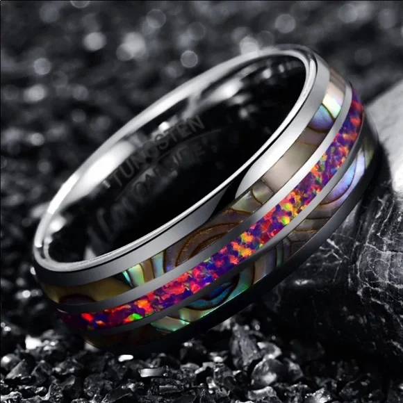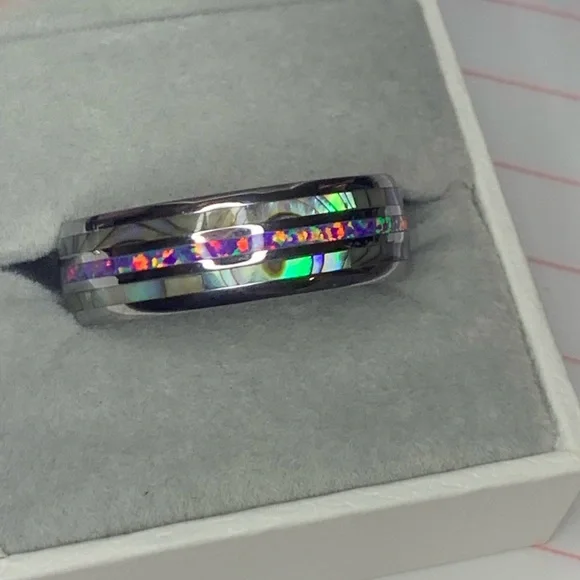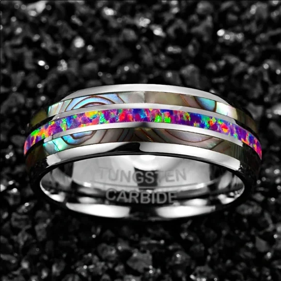 Size: 13.5Stunning. Vibrant. Unique! This wedding bands design exudes warms tropical vibes with crushed opal and abalone shell swirl inlays. This wedding ring brims with charisma featuring beautiful shades of lavender, purple, and pink opal that compliment the dual abalone shell inlays perfectly. The ring is classy and fashion forward for her tastes yet brings a rugged and masculine look for his. Opal is regarded as a lucky stone that symbolizes creativity and inspiration in Greek mythology. While some people use these as wedding bands, it is also an ideal promise ring, anniversary gift, or opal engagement ring. The intricate crushed opal & abalone inlays are protected on an ultra durable tungsten frame. This guarantees your opal wedding ring can endure even the harshest conditions while maintaining its signature style and comfort for decades to come.