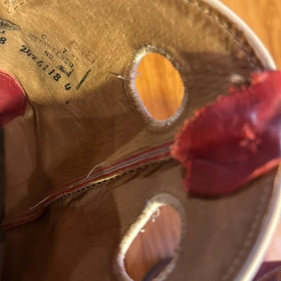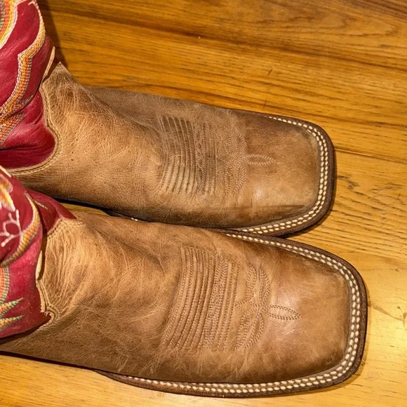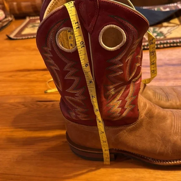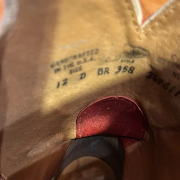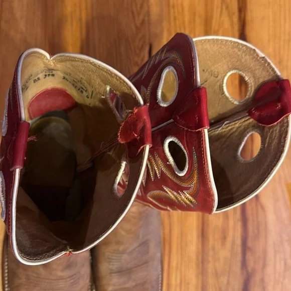 Justin boots size 12 D handcrafted in the USA. They are maroon is red with brown and a western flair for design. These were worn only a handful of times and are in good shape. Please note that one of the boots inside the red strap that goes around the top of the boot is frayed inside and a little bit on the outside. You don’t really notice it when wearing them. Please review all photos as they are part of the description. Smoke free home. Get them today.