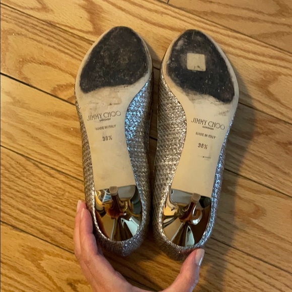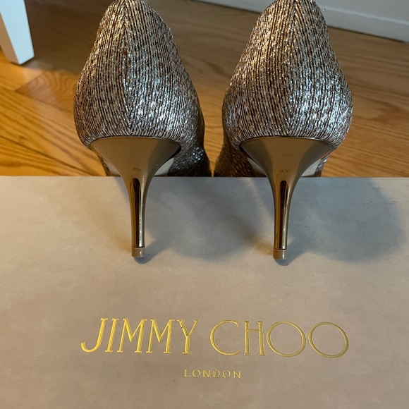 Authentic JC metallic fabric leather lining open toe pumps, very comfortable for walking dancing special occasion. Rose gold/champagne color. Fabric part is perfect, very small scratch on left open toe leather part not visible when you wear it, very very small not really visible scratches on the heels.comes with original box and shoe bags. 6,5cm hight of the heel.Leather sole (black marks are from walking on the wet surface)