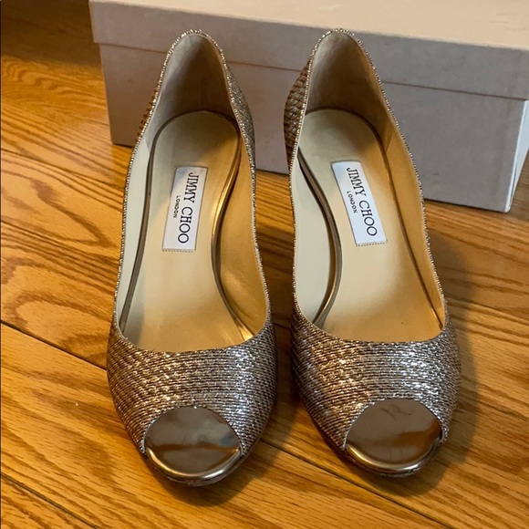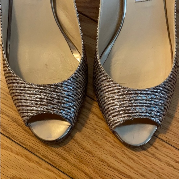 Authentic JC metallic fabric leather lining open toe pumps, very comfortable for walking dancing special occasion. Rose gold/champagne color. Fabric part is perfect, very small...