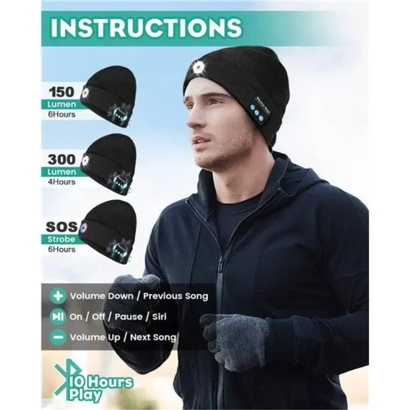 -[ Bright & Upgraded ] With 5 advanced LED light chips, our upgraded Bluetooth beanie with light at 250 lumens can offer you adequate light to support different night activities, such as night running, biking, camping, hiking, etc.-[ Bluetooth Headphone ] Enjoy listening to music with our beanie with Bluetooth headphones while keeping warm! Adopted with universal Bluetooth technology, our Bluetooth hat can connect to all bluetooth-enabled media player devices including smartphones, tablets, iPhone, iPad, Android, laptops, PC, etc.-[ Rechargeable & 3 Modes ] With USB-C charging cable and interface, our Bluetooth beanie hat can be recharged faster and more conveniently. One hour of charging offers 3 hours of brightness at most. Meanwhile, our wireless beanie Bluetooth hat has 3 modes as follows: Power Saving Mode, High Light Mode and Red/Blue Strobe Mode, giving you various choices and experiences.-[ Easy to Use & Wash ] One single and simple button achieves all functions. Press the button to turn on the light and change modes easily under any situation. Meanwhile, the LED light in the front of the hat is demountable, which means you can take it off conveniently and wash the hat with light individually and safely.