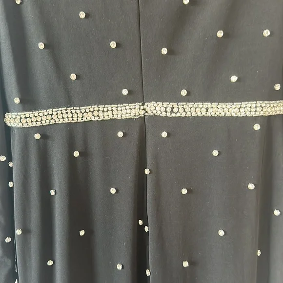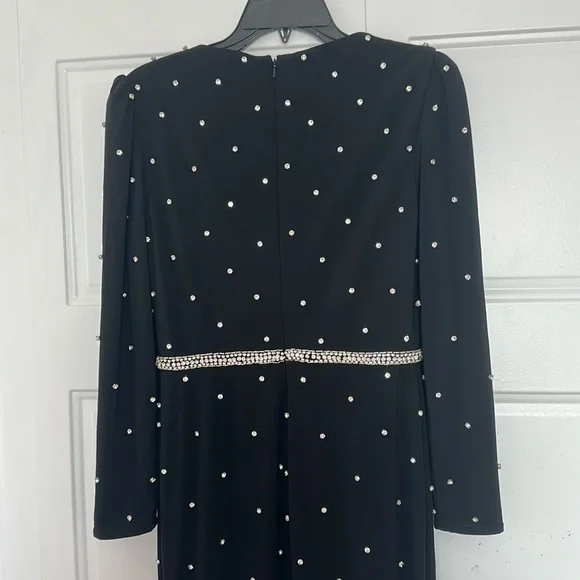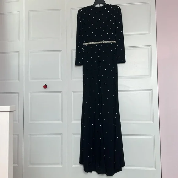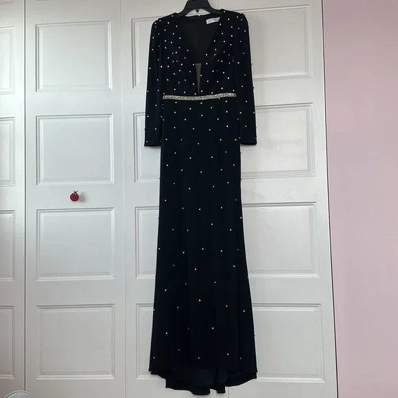 New without tag!Serve drama for cocktail hour and beyond in this column gown, sprinkled with sparkles and deeply dipped at the neckline.65" lengthPlunge neck with modesty panelLong sleevesLined100% polyesterSpot clean