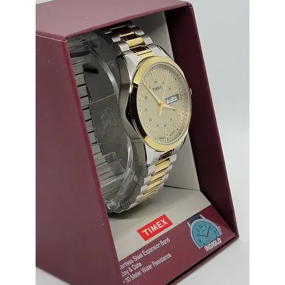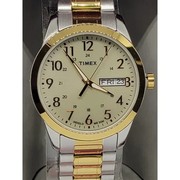 Round gold-tone dial with Indiglo backlight, luminous hands and gold-tone Arabic numerals makes reading easy.Mineral-crystal face cover prevents scratching.Day and date display keeps you on schedule.Quartz movement promises precision.Silver- and gold-tone stainless steel construction provides lasting shine.Clasp-free expansion band ensures a comfortable fit.Water resistant to 100 feetStainless steel backBattery operatedCase size: 36 mm
