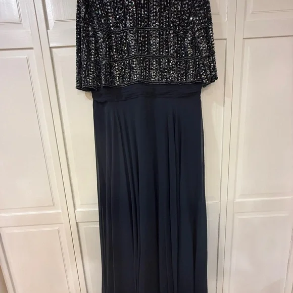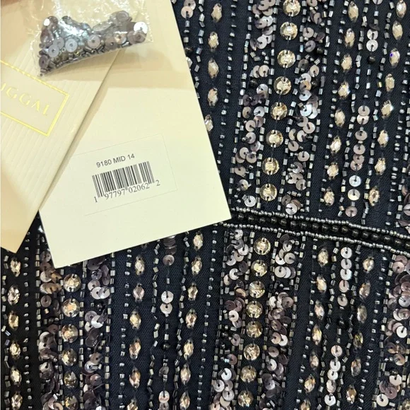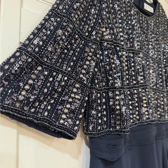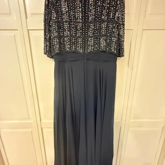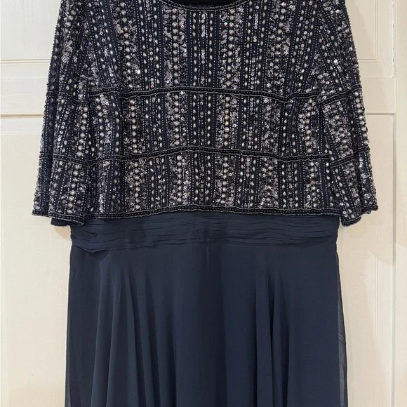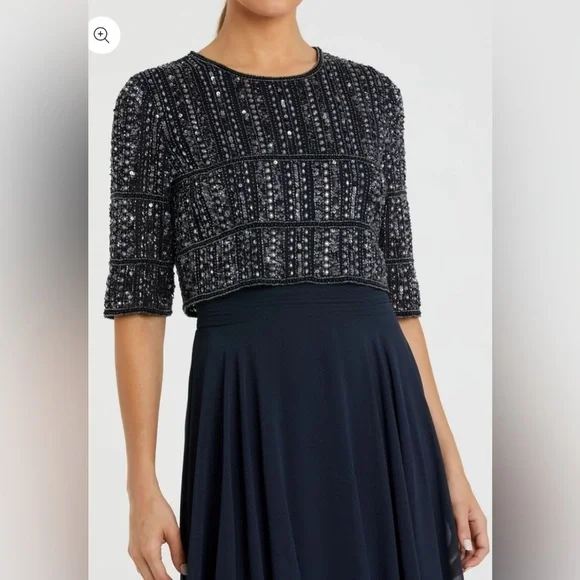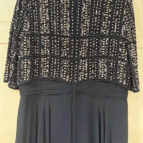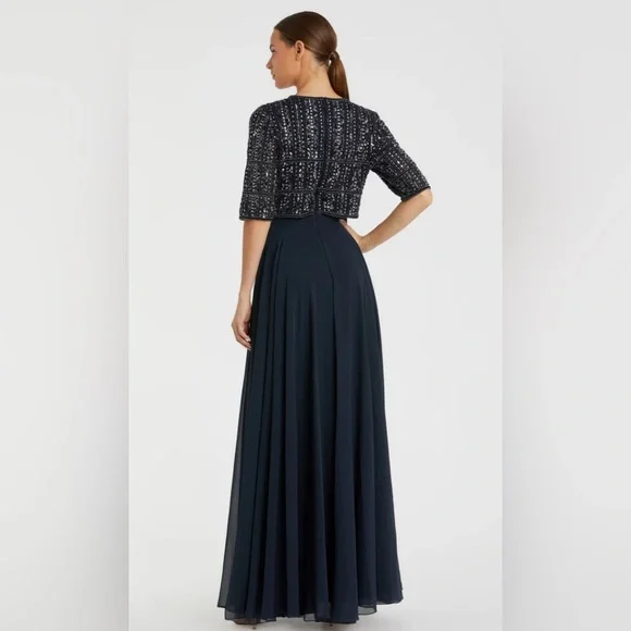 Exude elegance and grace in this beaded chiffon gown. Crafted from flowing chiffon fabric, it seamlessly blends comfort and sophistication. Perfect for formal occasions and evening events, this timeless gown is sure to make a statement. Mac Duggal Chiffon fabric (100% polyester) Fully lined High neckline3/4 sleevesBeaded detailingConcealed back zipperApprox. 60" from top of shoulder to bottom hemAvailable in MidnightStyle #9180Tags: Mother of the Bride, homecoming, pageant, date night, holiday party, gala, wedding guest, military ball, photoshoot, engagement pictures, old Hollywood, red carpet, formal, evening gown, elegant, army ball, marine ball, classy dress, black tie, charity event, guest of wedding, prom, quinceanera, special occasion, mother of the bride, awards season, garden partyPlease note due to the intricate nature of the gown, it´s possible there could be a slight flaw loose string, missing bead or sequin, etc.) After close review, I´m not finding anything major.