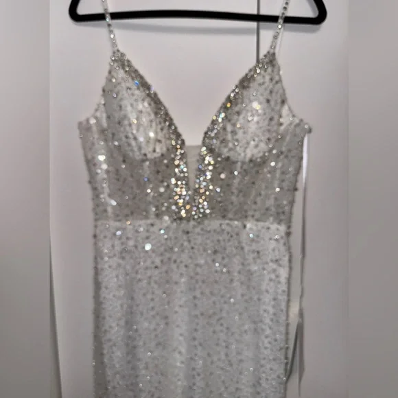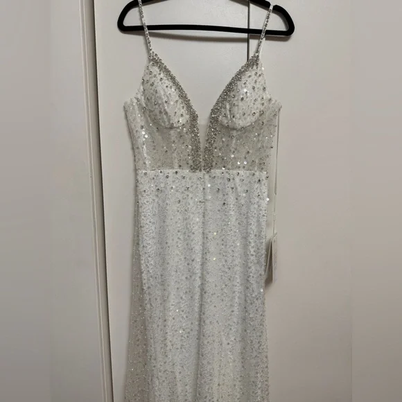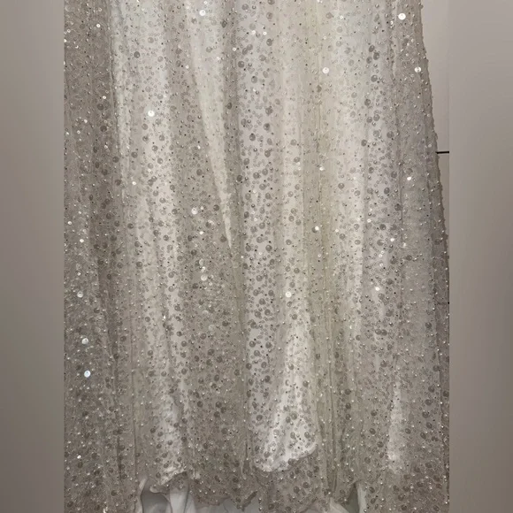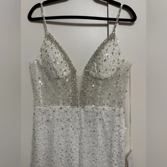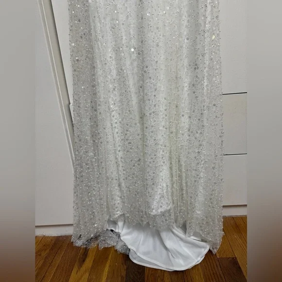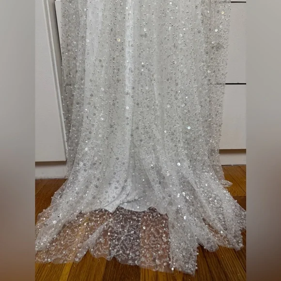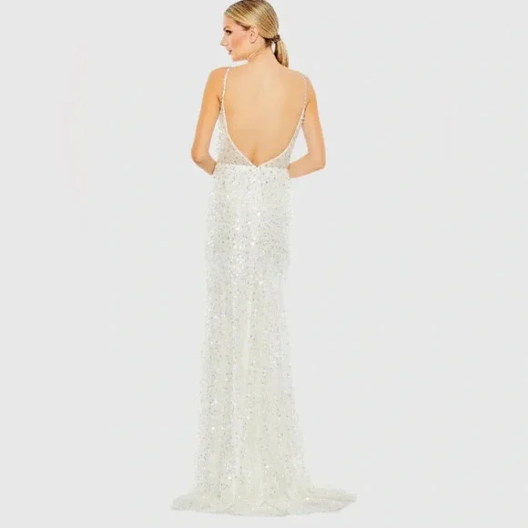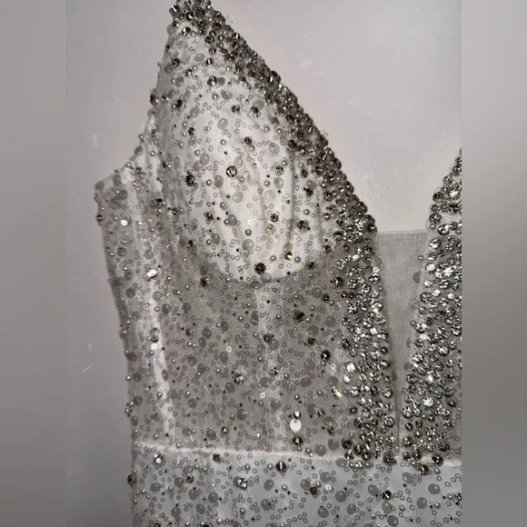 This stunning gown features a sweetheart neckline and a sleeveless design, perfect for a bride. The embellished bodice is adorned with intricate detailing, flowing into a lightweight drapes beautifully to the floor. Its backless style adds a touch of allure, making it an exquisite choice for your special day.Tags: homecoming, pageant, date night, holiday party, gala, wedding guest, military ball, photoshoot, engagement pictures, old Hollywood, red carpet, formal, evening gown, elegant, army ball, marine ball, classy dress, black tie, charity event, guest of wedding, prom, quinceanera, special occasion, mother of the bride, awards season, garden partyPlease note due to the intricate nature of the gown, it´s possible there could be a slight flaw loose string, missing bead or sequin, etc.) After close review, I´m not finding anything major.