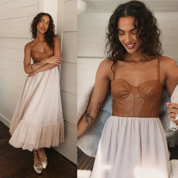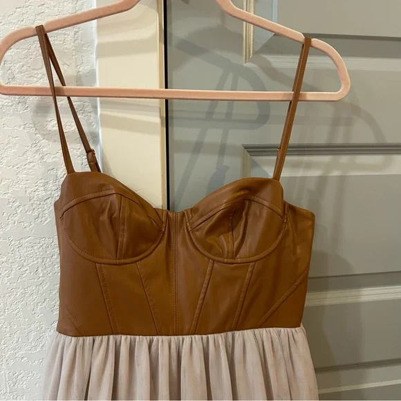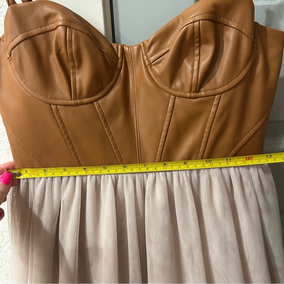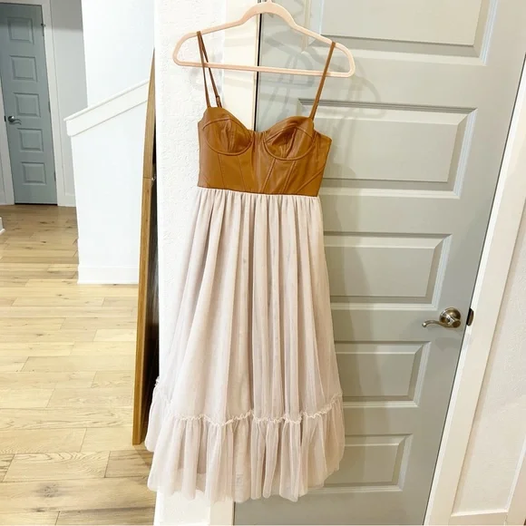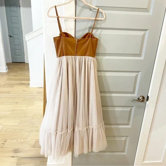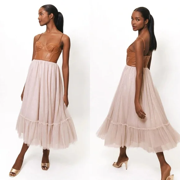 Brand new without tags. Size is missing. Measures XS.Effortlessly femme and fun, this unique dress features faux leather detail at the bodice and a billowy tulle skirt with a sweetheart-neckline and back-zip closure.Fit: Fitted bodice, relaxed skirt, A-line hemFeatures: Faux leather bodice, billowy tulle skirt with ruffled hem, corset-inspired detailing, sweetheart-neckline, adjustable shoulder straps, back-zip closure, linedWhy We ❤ It: This midi is sure to turn heads with every wear.