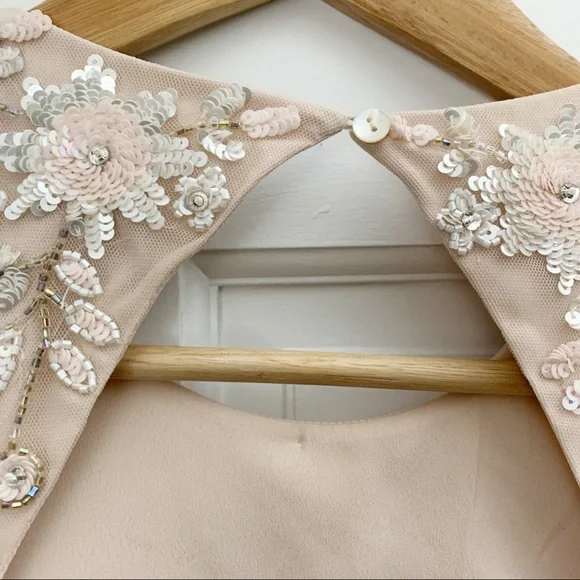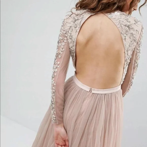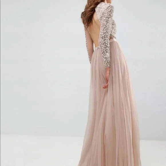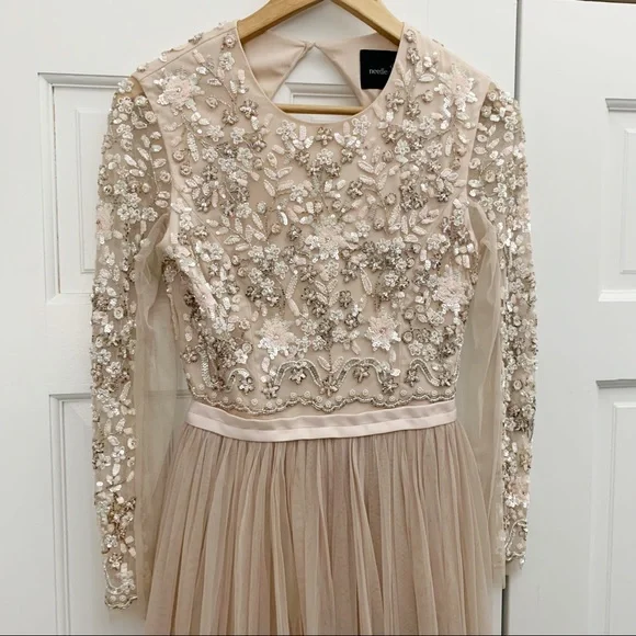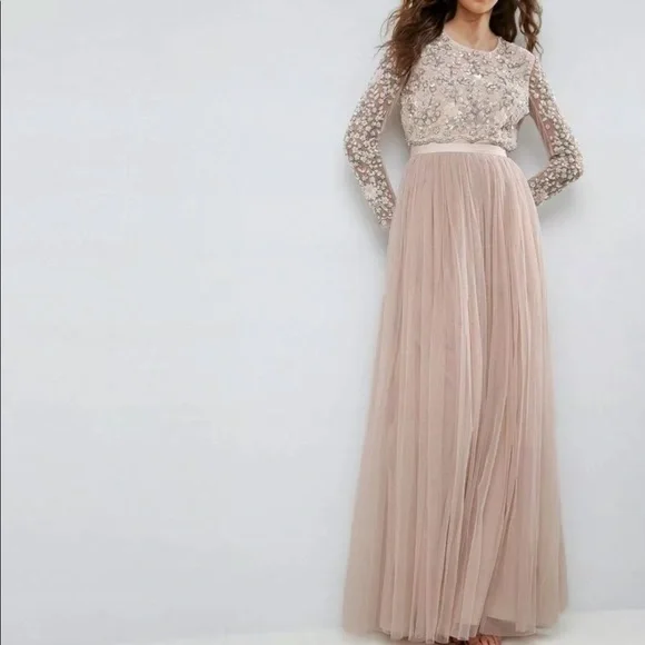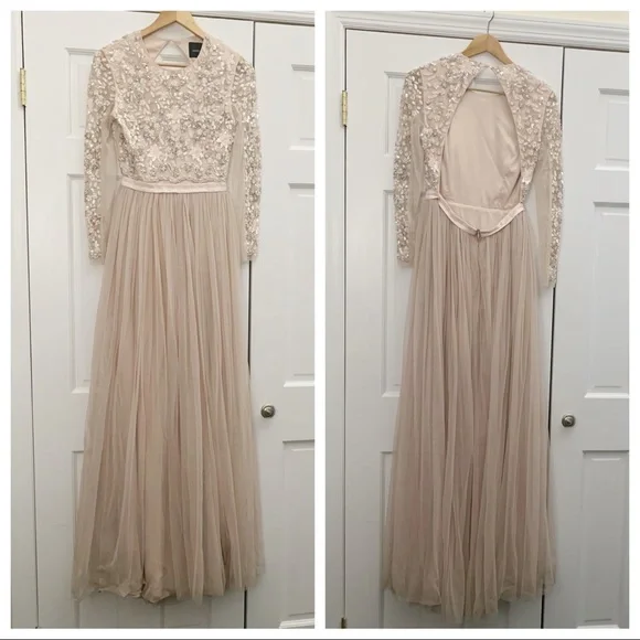 Gently worn and in good condition but has some dirt stains on the bottom of the tulle.Maxi dress by Needle & Thread Lined mesh top Bead and sequin embellishment Round neckline...