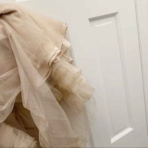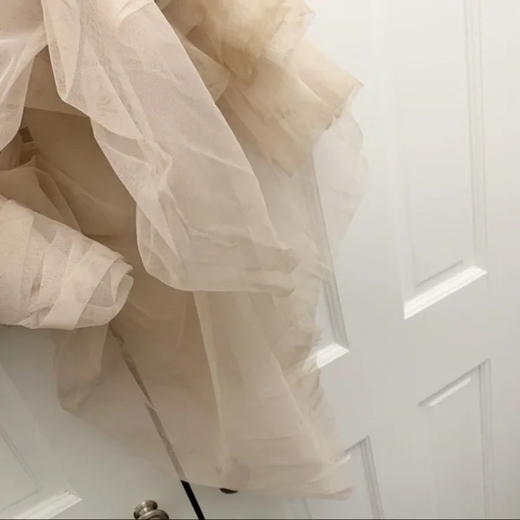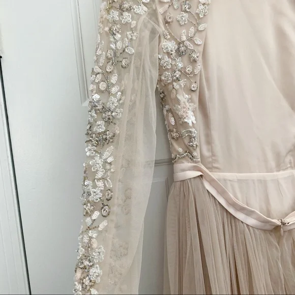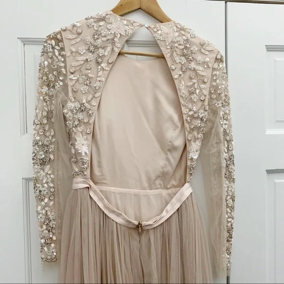 Gently worn and in good condition but has some dirt stains on the bottom of the tulle.Maxi dress by Needle & Thread Lined mesh top Bead and sequin embellishment Round neckline Sheer sleeves Layered tulle skirt Open button keyhole backApproximate Measurements Bust: 17”Waist: 13”Length: 60”KL-749