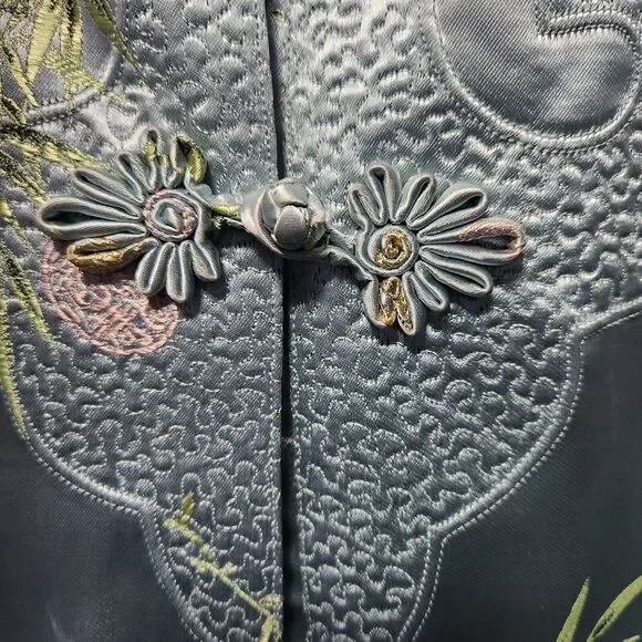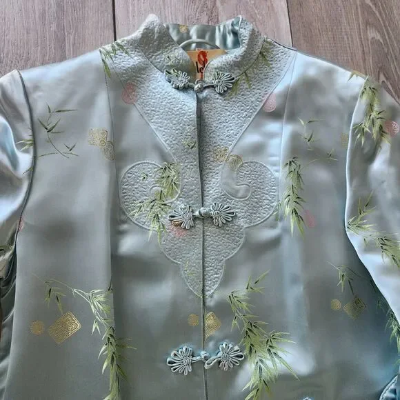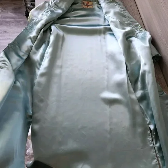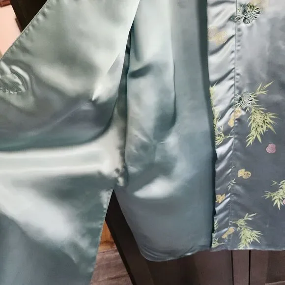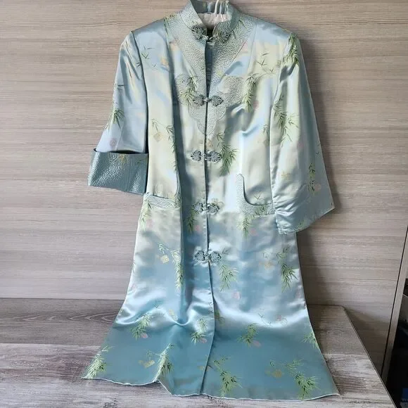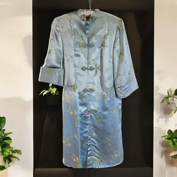 Mulchands Womens Vintage Asian Kimono Midi Dress Silk Light Blue Duster RobeBrand: MulchandsColor: Light BlueGender: WomenPattern: Bamboo LeafFeature: Lightweight / Kimono SleeveType: Midi DressStyle: Duster RobeApprox. Measurements: Lay Flat on tableShoulder across 14.5 inPit to pit 18.5 inLength 44 inSleeve 19 in (15 inches when cuff folded)Pre-owned, Fantastic Condition. - Zoom in on pics. Vintage - wears like a S/M - see measurements and measure against your own clothing.Thank you for taking some time to check out our listing! If you are liking what you see please check out our store!Follow us and and keep an eye out for what we will be posting next!#Asian #Chinese #Robe #Duster #Silk #Elegant #Housedress #Cardigan #Costume #Prop #Dynasty #vintage #antique #jacquard #coat #jacket #dress #brocade #traditional #pankou #knot #button