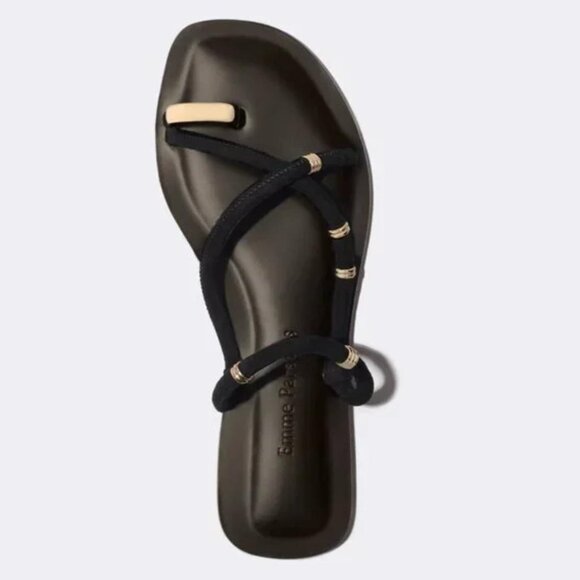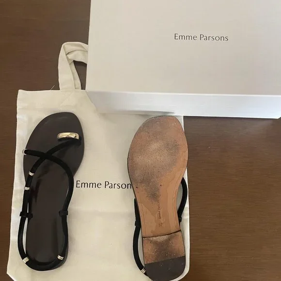 Brand new, only worn once Emme Parsons Laurie sandal in Black. Excellent condition, with original box and dust bag. Perfect for someone who is looking for a minimal, classic summer sandal. They recommend sizing one full size up, but it fits pretty true to size for me. Wider feet might prefer the next size up. Selling as they´re the look for me, and I can´t return. Bought originally for list price $425 (with tax + shipping), this is an excellent discounted price!DETAILSMaterials: Suede, Nickel bijoux and zamac toe ring with gold finish.REACH certified for responsible leather production.Heel Measurement: .5"/10mm (approximately).From Website:A sleek design with a gold toe ring that elevates an evening out, the Laurie Bijoux’s soft nappa cording fits over the vamp of the foot and features rows of tiny gold bijoux.This sandal is designed with a strap to fit across the vamp of the foot. The strap may fit around the ankle on certain feet but will feel more comfortable when worn across the vamp.