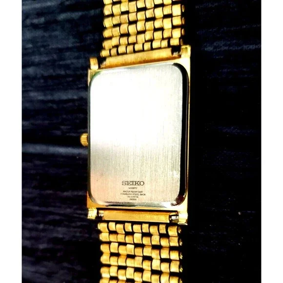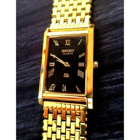 Vintage NOS Seiko Mens Gold Tank Rectangular Milanese band RARE Black Wave Dial Dress Watch Beautiful NOS New old Stock Beautiful Seiko Tank What s pictured is what ships Please make sure you read and understand this before bidding. - Make sure you know what you are bidding on and what is included or not included in the auction. You will not receive batteries, boxes, bags, certificates, instructions, or any other item not mentioned or pictured. If it doesn´t say it in the description, you probably won´t get it. - I am not responsible for items getting lost in shipping. Once I turn the item over to the USPS, it is on them. I ship everything with tracking and If something has been shipped but you do not get it, please contact the USPS first. - I am also not responsible for porch pirates. See the last bullet point. Anything that sells for $300+ is shipped signature required to protect you. If you want me to include signature on items under $300, let me know. - Because of the age of most of the items I sell, there may be flaws of which I am not aware. I try to describe the items as well as I can, but I may miss something. Therefore, all items are sold as-is with no warranty or guarantee. Please look at all photos and ask questions before bidding.