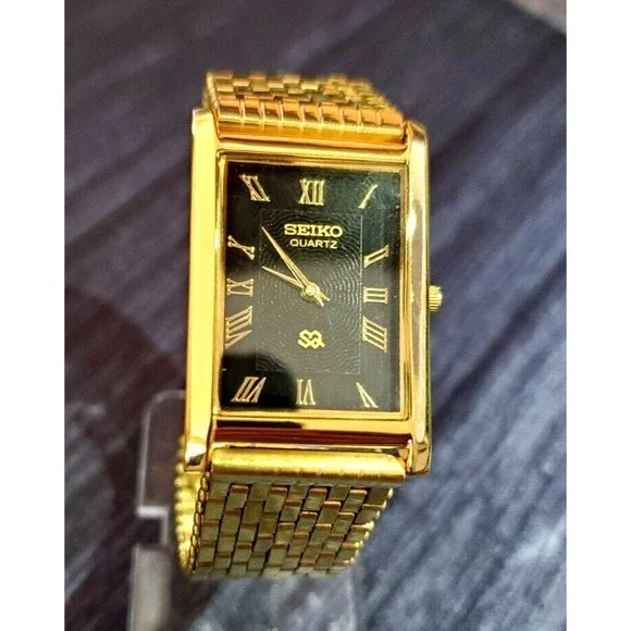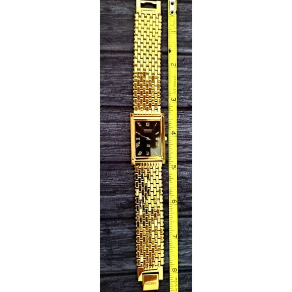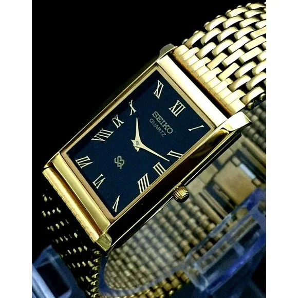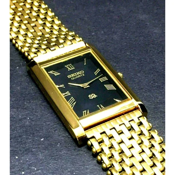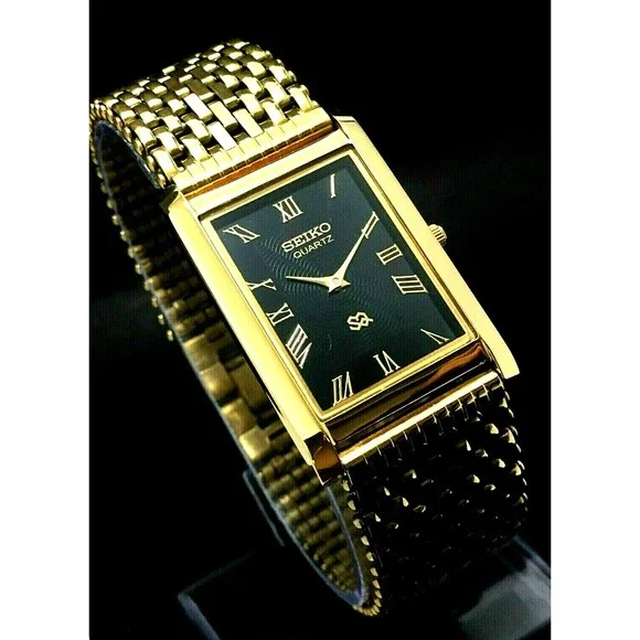 Vintage NOS Seiko Mens Gold Tank Rectangular Milanese band RARE Black Wave Dial Dress Watch Beautiful NOS New old Stock Beautiful Seiko Tank What s pictured is what ships Please make sure you read and understand this before bidding. - Make sure you know what you are bidding on and what is included or not included in the auction. You will not receive batteries, boxes, bags, certificates, instructions, or any other item not mentioned or pictured. If it doesn´t say it in the description, you probably won´t get it. - I am not responsible for items getting lost in shipping. Once I turn the item over to the USPS, it is on them. I ship everything with tracking and If something has been shipped but you do not get it, please contact the USPS first. - I am also not responsible for porch pirates. See the last bullet point. Anything that sells for $300+ is shipped signature required to protect you. If you want me to include signature on items under $300, let me know. - Because of the age of most of the items I sell, there may be flaws of which I am not aware. I try to describe the items as well as I can, but I may miss something. Therefore, all items are sold as-is with no warranty or guarantee. Please look at all photos and ask questions before bidding.