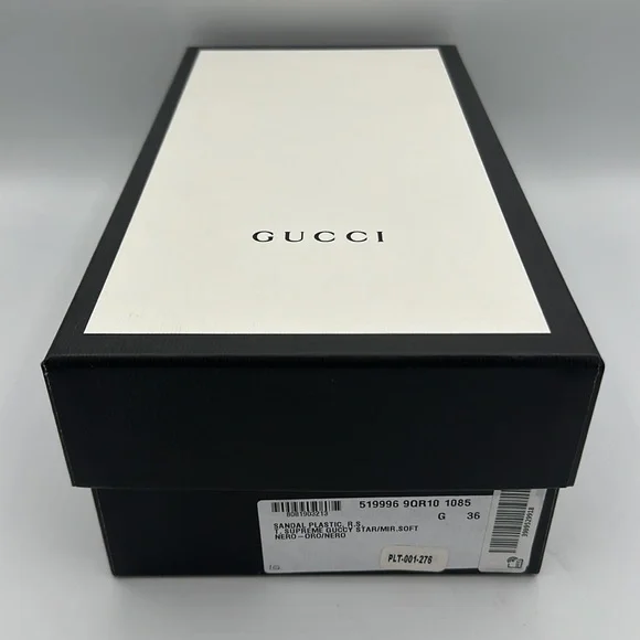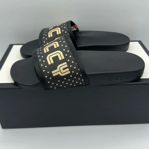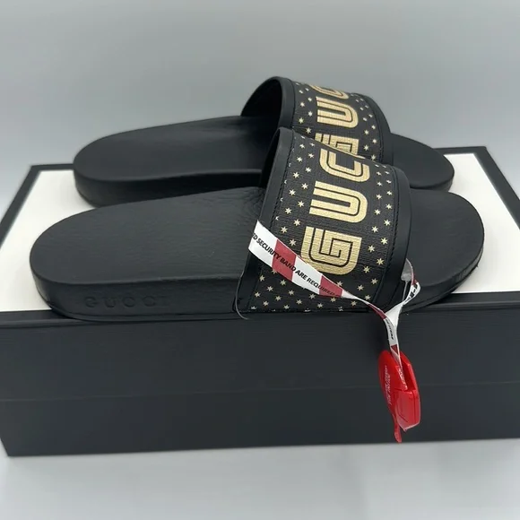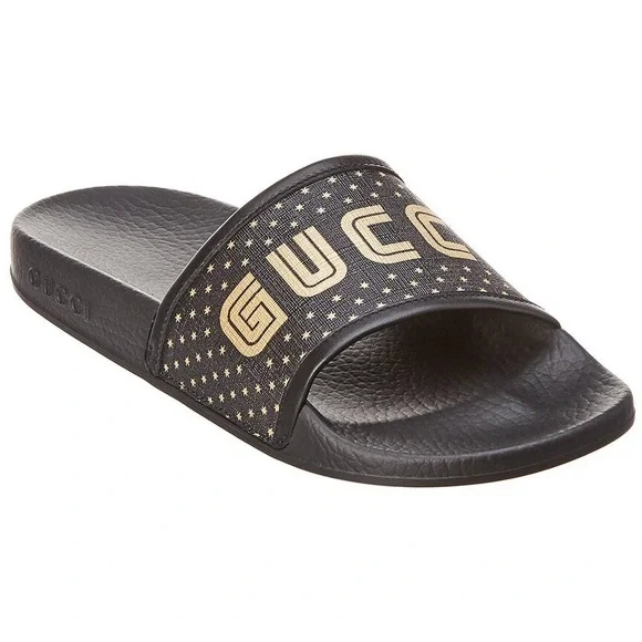 An homage to eighties video gaming culture, the Guccy print draws inspiration from the SEGA logo—a fixture in the colorful arcades and coin-op game rooms of the time. The graphic font appears on the slide sandal, combined with a stars motif in a metallic gold print. Black Supreme canvas with stars and Guccy in SEGA font, used with permission of Sega Holdings Co., Ltd. Black leather trim. Molded rubber footbed. Made in Italy.Composition:Sole: Rubber 100%Outer: Leather 100%, Canvas 100%Includes box and dust bagsSize 36 EU = 6 US