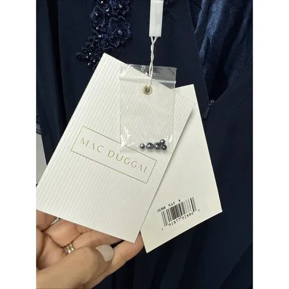 MAC DUGGAL Blue Embellished Illusion V Neck Long Sleeve GownSize 8Original retail price $698 New with tags from a smoke free home. Mac Duggal Embellished chiffon fabric (100% polyester) Fully lined through body; sheer unlined sleevesV-neckLong illusion sleeves Floral detailing with beads and sequinsConcealed back zipperApprox. 60" from top of shoulder to bottom hem Available in NavyStyle #20388Cocktail, wedding, formal, special occasion, event, black tie, military ball, mother of the bride groom, Mardi Gras ball, evening, gown, prom, pageant, elegant, fancy party