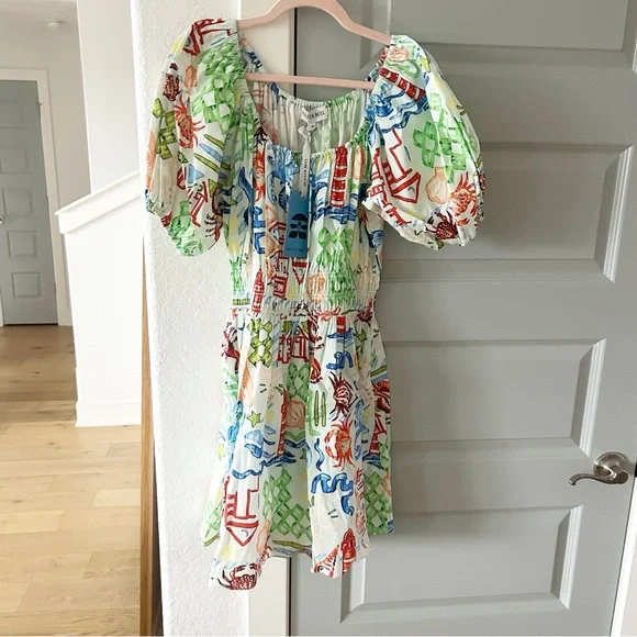 Brand new with tags. Size 4 or 8. The Drew dress was designed to embrace the spirit of spring with effortless style and flirtatious charm. Featuring a scoop neckline with drawstring tie detail, a smocked elastic waist and a shirred mini skirt, we predict Drew will be a star this season.• Scoop neckline with drawstring tie detail• Short puff sleeves with elastic cuffs• Smocked elastic waist• Shirred skirt• Side seam pocketsFabric details:• Cotton poplin• 100% Cotton