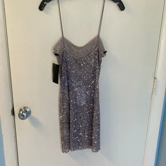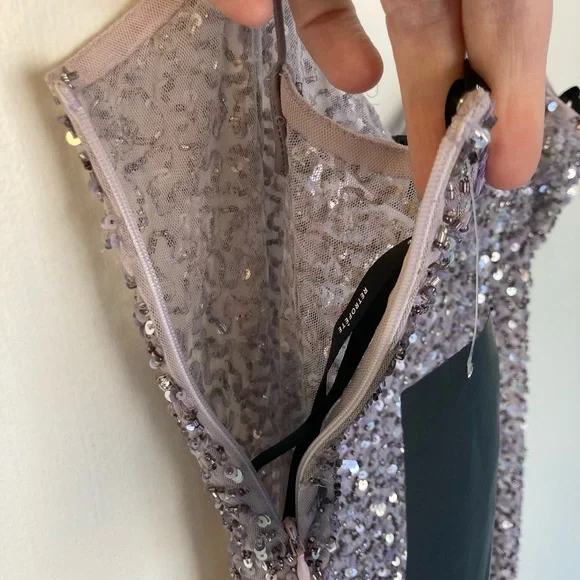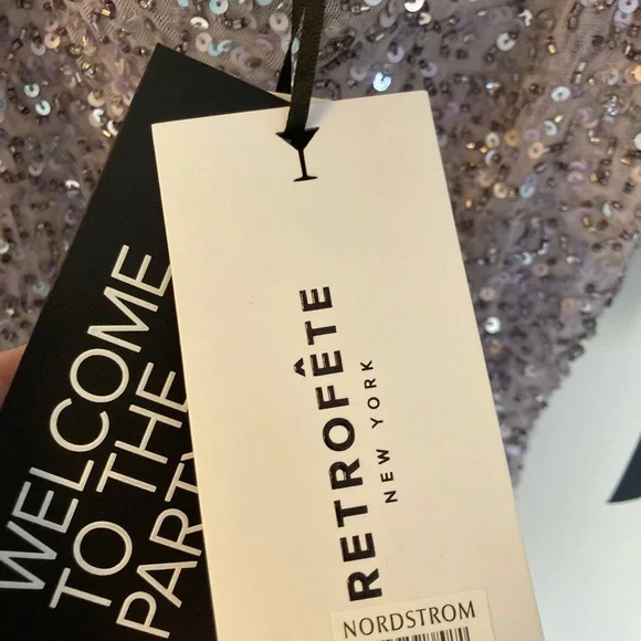 NWT Retrofete Sheila Sequin Dress, size small. Comes with extra beads/sequins in black pouch. Color is listed as Mink Grey. Please note dress is unlined.Details:100% nylonUnlined Barely there strapsLeft zip panel zipperAll-over sequinsMade in IndiaPlease let me know if you need any more photos or measurements!