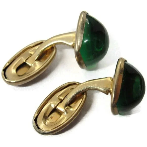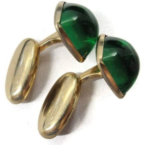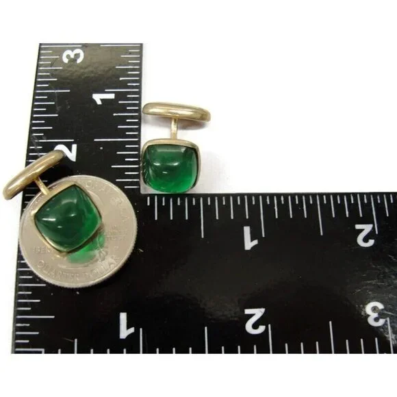 9Kt Yellow Gold Cuff Links Green Cabochon GlassGood Working Condition - Vintage scuffs, scratches possible these are not new old used pre-ownedPlease look at all photos as they are part of the item description These were tested with Gemoro Gold Tester to be 9k