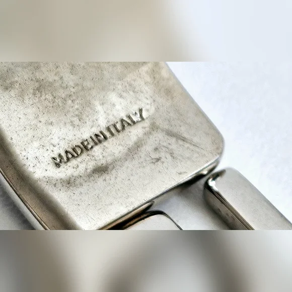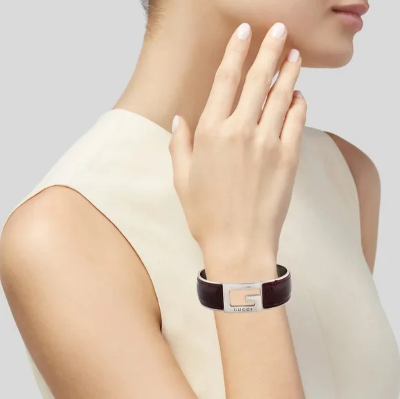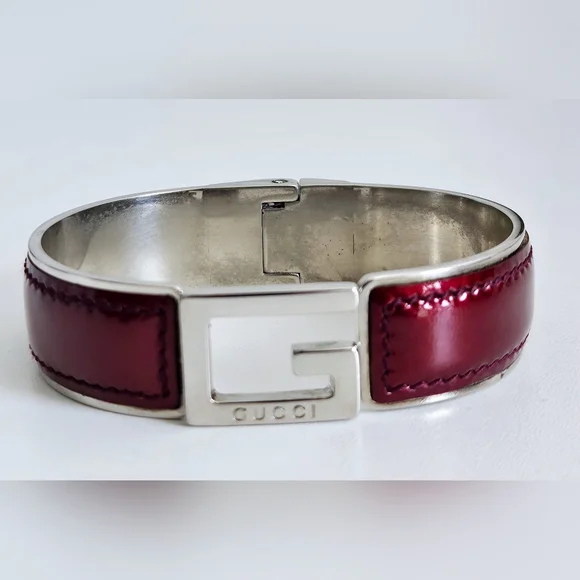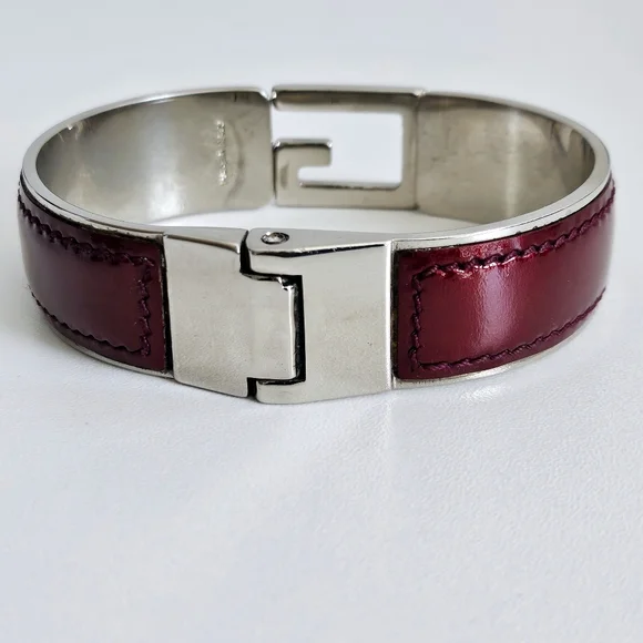 Authentic pre-owned bangle in silver metal and burgundy patent leather. Outside is in excellent condition, inner metal shows some color loss.- Length: 8.25"- Width: 0.75"