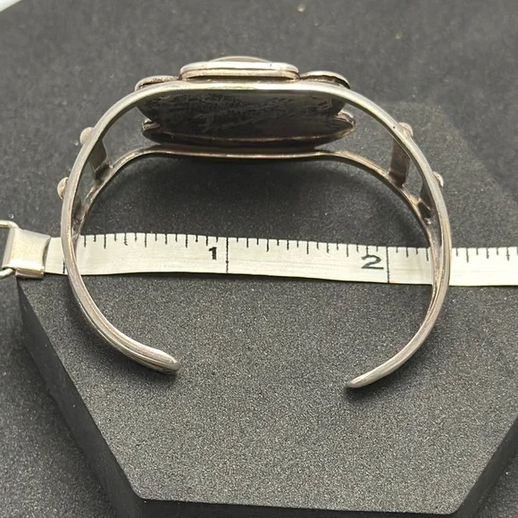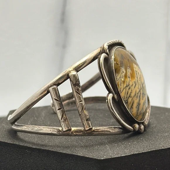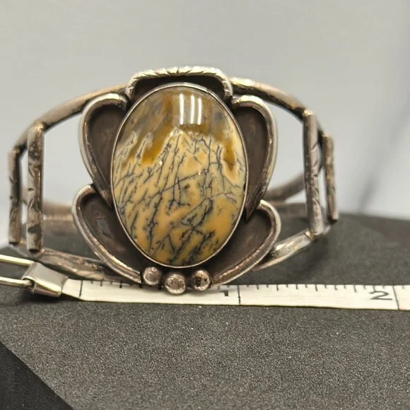 This elegant bracelet features a stunning silver and gold-toned design, perfect for adding a touch of sophistication to any outfit. Its unique pattern makes it a standout piece in any jewelry collection.Huge Signed Native American Sterling Silver and Moss Agate Cuff signed by maker and Sterling Adjustable open cuff huge center stone like Picasso JasperSigned B. Ranney confirmed by artist Tags for visibility: cute simple minimal vintage antique scroll swirl French design style shape clasp spring clasp silver metal gift present friend unique shaped estate vintage designer statement long big classic minimal antique retro old school classy bling flowers vines scrolls filigree cut out holes prong crystal Diamond gemstone silver sterling marked hallmarked signed fall winter present: Vintage Y2K, grunge, 1980 1990s skinny bracelets, stacking, layering sterling antique gold plated old pawn turquoise green stone blue stone moon stone bezel Zuni Native American Navajo sterling turquoise southwestern western cowboy precious stones silver and blue taxco Mexico polish amber resin trendy beautiful stones gorgeous pieces stamped hallmarked 925 .925 gold rolled ster 14k gold vermeil signed detailed minimal petite small bling ornate unique strange custom assortment lot MOD MCM VNTG