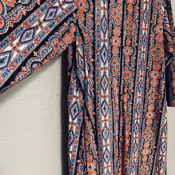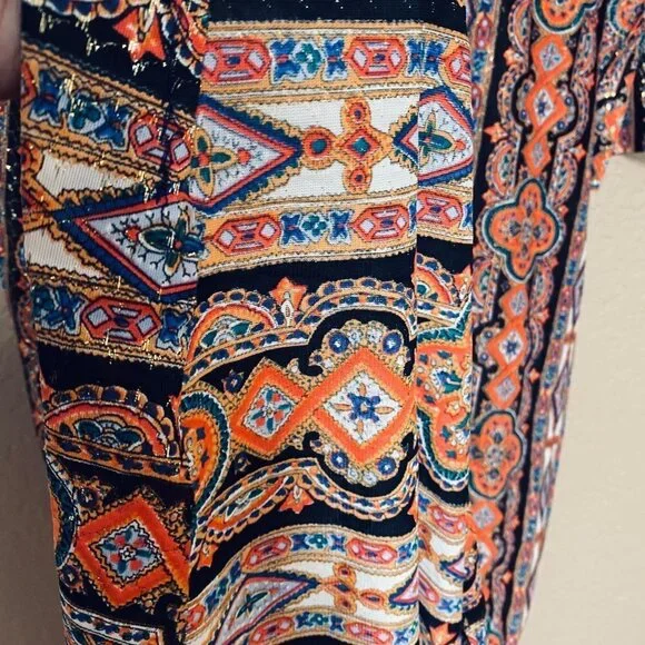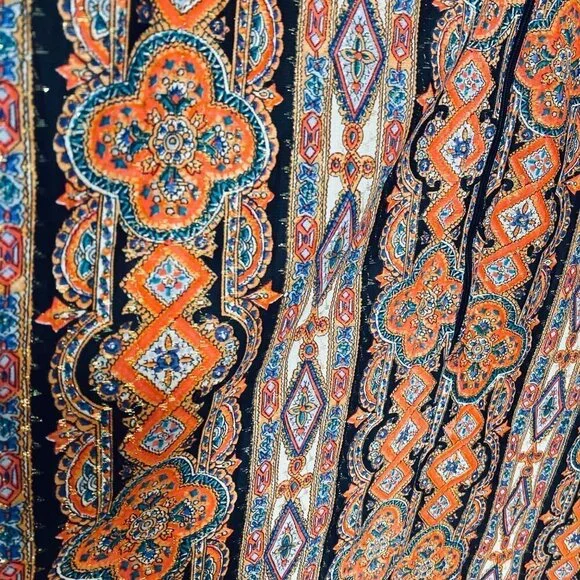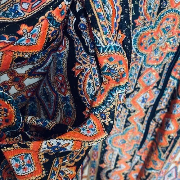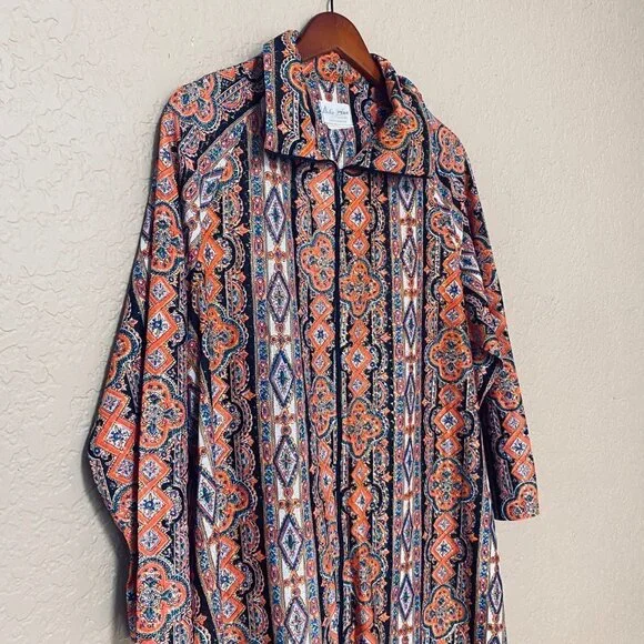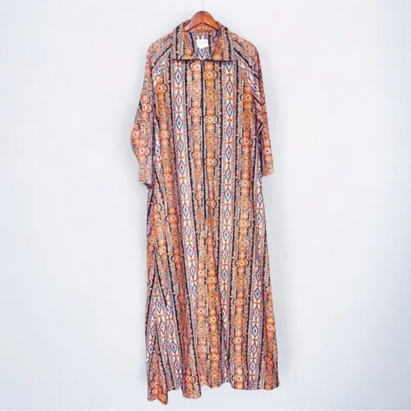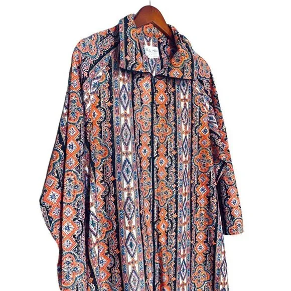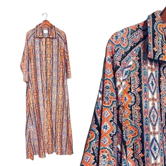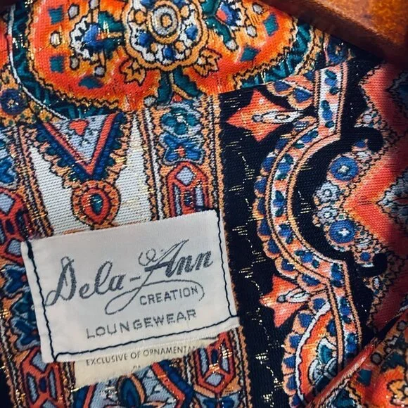 Della-Ann Womens 70s Maxi Dress Size Medium Multicolored Long Shimmering Half Zip Collared Long SleeveItem Details:Dela-Ann creations vintage house coat/robe Could double as a dress Lightweight and flowingAlineHas pocketsBlack orange white gold colorsAlthough there’s no material tag I would say this is a polyester and silk blendCan easily fit a dress size 14/16 with roomMeasurements in inchesLength: 60Shoulder to shoulder: 20Armpit to armpit: 23Waist around: 50Hips around: 60Sleeve length: 21For office use only: 014Available to answer any questions. Quick shipping and multi-item discounts.