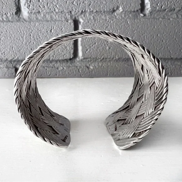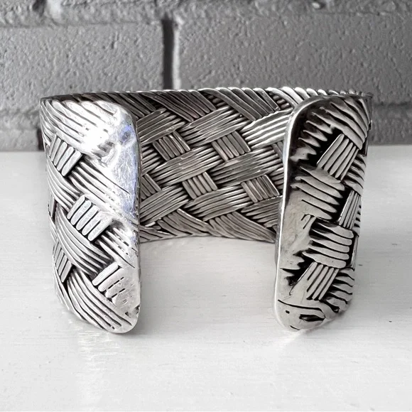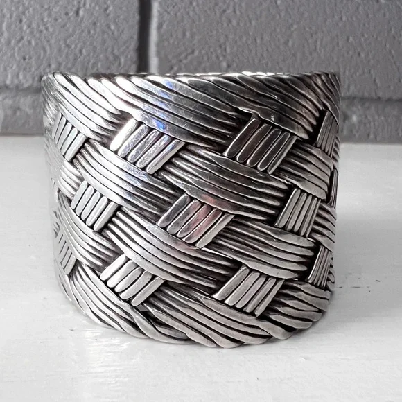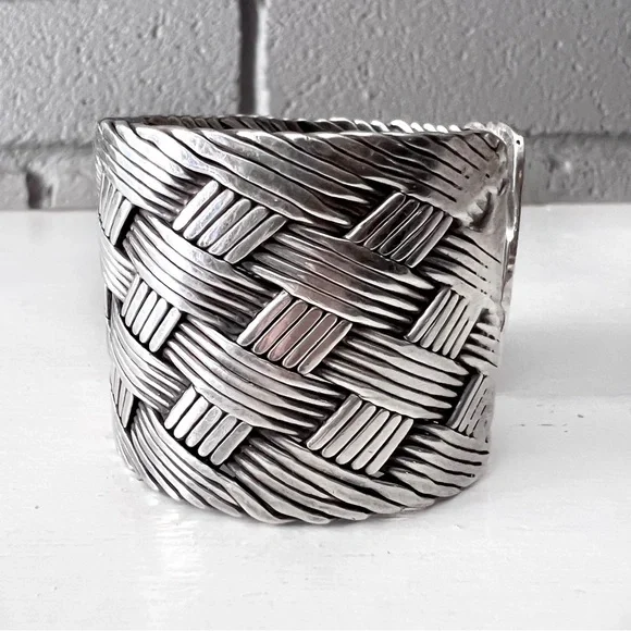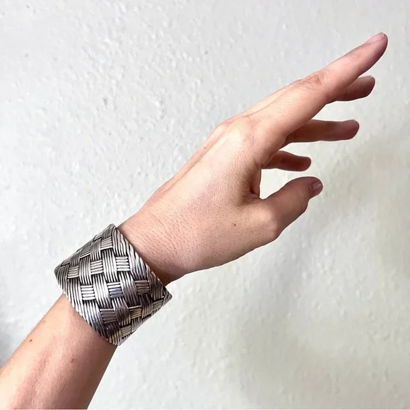 Add to your collection of vintage & sterling goodies w/ this beautiful Huge Sterling Silver Mexico Woven Cuff!This is SUCH a cool cuff! Sterling silver is woven together (not cast!) in a crosshatch/basket weave geometric pattern to form a statement making piece! Has a timeless look w/ modernist twist! Looks great styled & stacked w/ other favorites!Excellent vintage condition! A eye catching piece of silver!Marked MEXICO 925Inside measures 6” end to endGap is currently 7/8”, could easily be adjusted up or down for comfortable fit1 5/8” wide89 grams of silver!!From a smoke & pet free home! See my items for more turquoise, vintage & new goodies! Bundle multiple items to save on price & get up 5 lbs for the same shipping cost!
